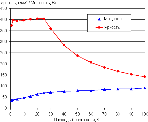 С изменением площади белого максимальная яркость также может меняться, при этом характер зависимости яркости от площади белого участка зависит как минимум от выбранного профиля, настроек изображения и от текущего режима — SDR или HDR. Например, в режиме Игрок 1 и сигнала SDR яркость от 1% до 100% площади белого сохраняется на уровне 190 кд/м². Тогда как в случае профиля Яркий и сигнала SDR зависимость яркости от площади белого имеет следующий вид (дополнительно по вертикальной оси отложена потребляемая мощность):