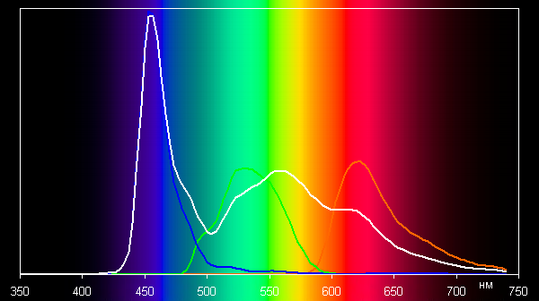 Участие белого субпикселя проявляется в частности в том, что спектр белого явно не является простой суммой спектров красного, зеленого и синего цветов. Отметим, что белый субпиксель позволяет легко смещать баланс яркости белых участков относительно цветных. Тем не менее, визуально дисбаланса яркости не наблюдается.