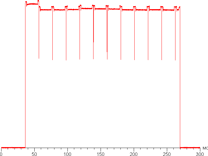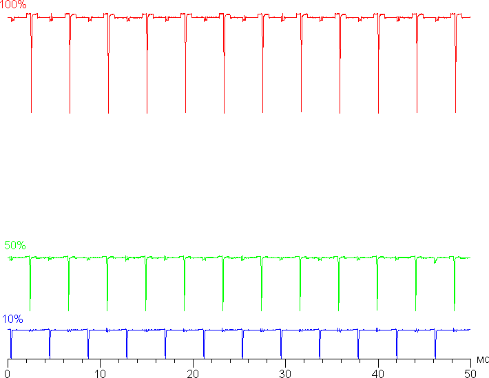 На любом уровне яркости видимое мерцание отсутствует, его не выявляет и тест на стробоскопический эффект. Регистрация зависимости яркости от времени при различных уровнях яркости выявила модуляцию яркости с очень высоким коэффициентом заполнения, что и объясняет отсутствие мерцания. В доказательство приведем графики зависимости яркости (вертикальная ось) от времени (горизонтальная ось) при различных значениях настройки Яркость в случае белого поля на 10% от площади экрана.