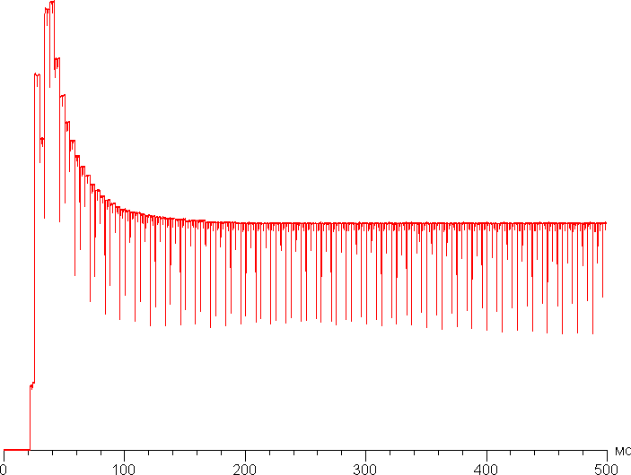 Время отклика очень мало, так как состояние пикселей меняется практически мгновенно. На фронтах переходов, как правило, нет выраженных ступенек, а значит, и артефакты в виде шлейфов, тянущихся за двигающимися объектами, исключены. Для примера приведем график изменения яркости (вертикальная ось) от времени (горизонтальная ось) в случае переходов между черным и белым и обратно: