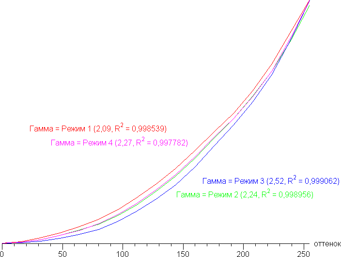 Реальная гамма-кривая зависит от выбранного профиля в списке Гамма (значения показателей аппроксимирующей функции приведены в скобках в подписях, там же — коэффициент детерминации):