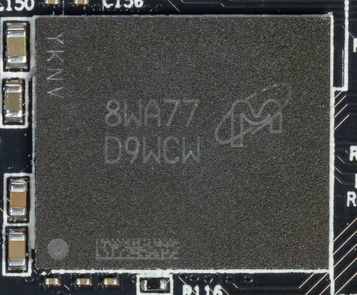 Карта имеет 6 ГБ памяти GDDR6 SDRAM, размещенной в 6 микросхемах по 8 Гбит на лицевой стороне PCB. Микросхемы памяти Micron (GDDR6) рассчитаны на номинальную частоту работы в 3500 (14000) МГц