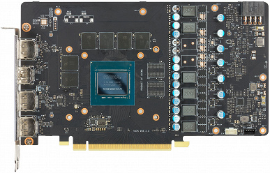 Схема питания построена на базе цифрового преобразователя iMon DrMOS (4+2 фазы) и управляется цифровым контроллером. Карта получает питание через один 8-контактный разъем.