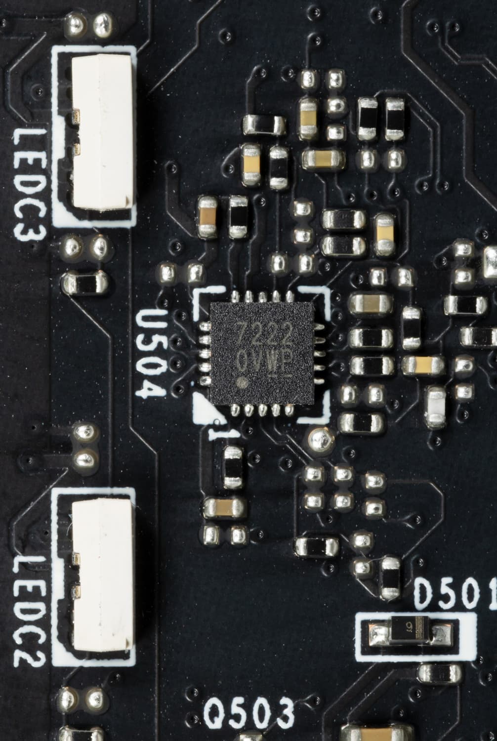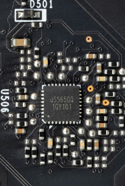 На той же оборотной стороне имеется контроллер uS5650Q (uPI Semiconductor), который, как известно, многофунциональный. Он может осуществлять мониторинг и управлять 4 фазами. Поэтому возможно, что управление 3 фазами питания ядра возложено на него (плюс функции мониторинга).