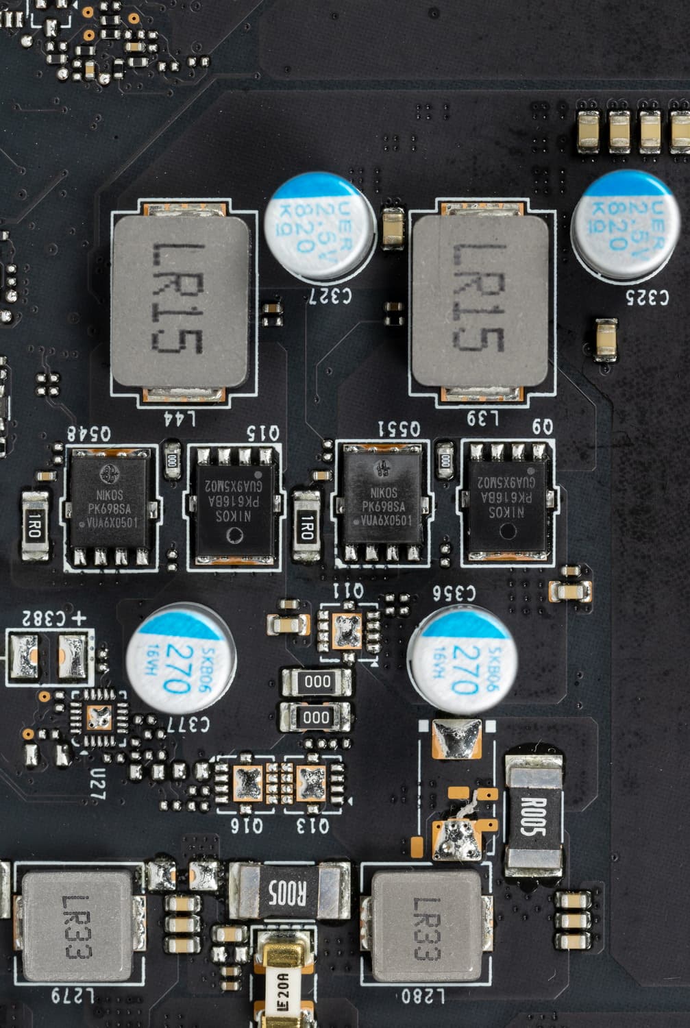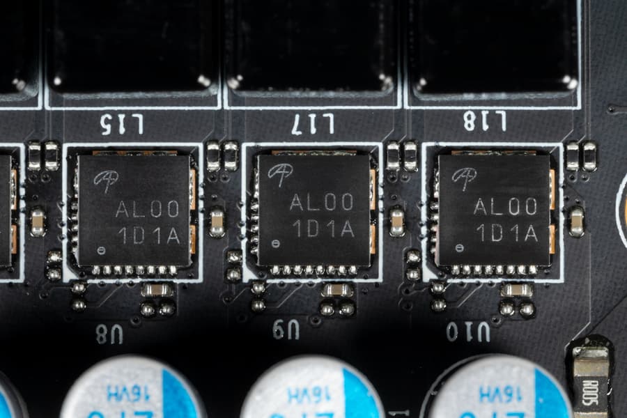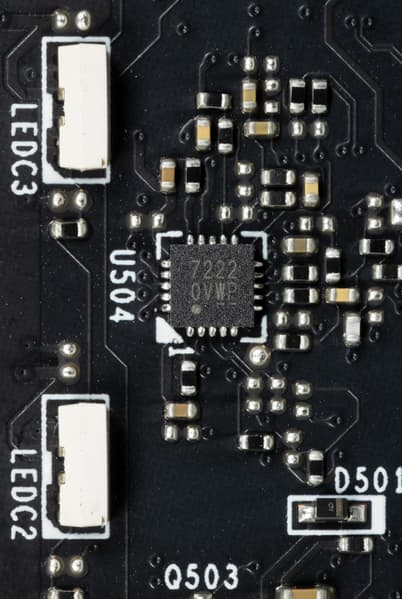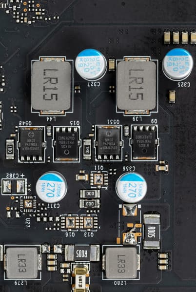 В преобразователе питания GPU, традиционно для всех видеокарт Nvidia, используются транзисторные сборки DrMOS — в данном случае Alpha&Omega Semiconductor, каждая из которых рассчитана максимально на 55 А.