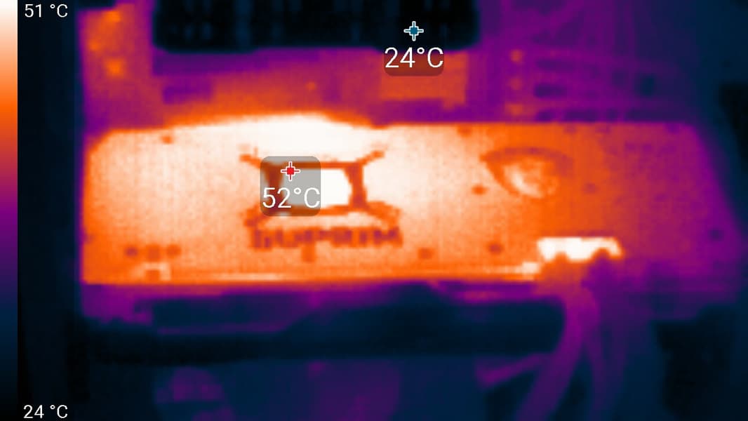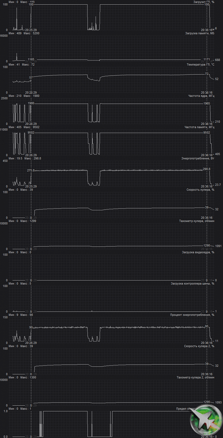 В этом случае максимальная температура ядра достигала 72 градусов, а микросхем памяти — 88 °C, что, в принципе, является неплохим результатом для видеокарт такого уровня. Энергопотребление карты практически не изменилось (297 Вт).