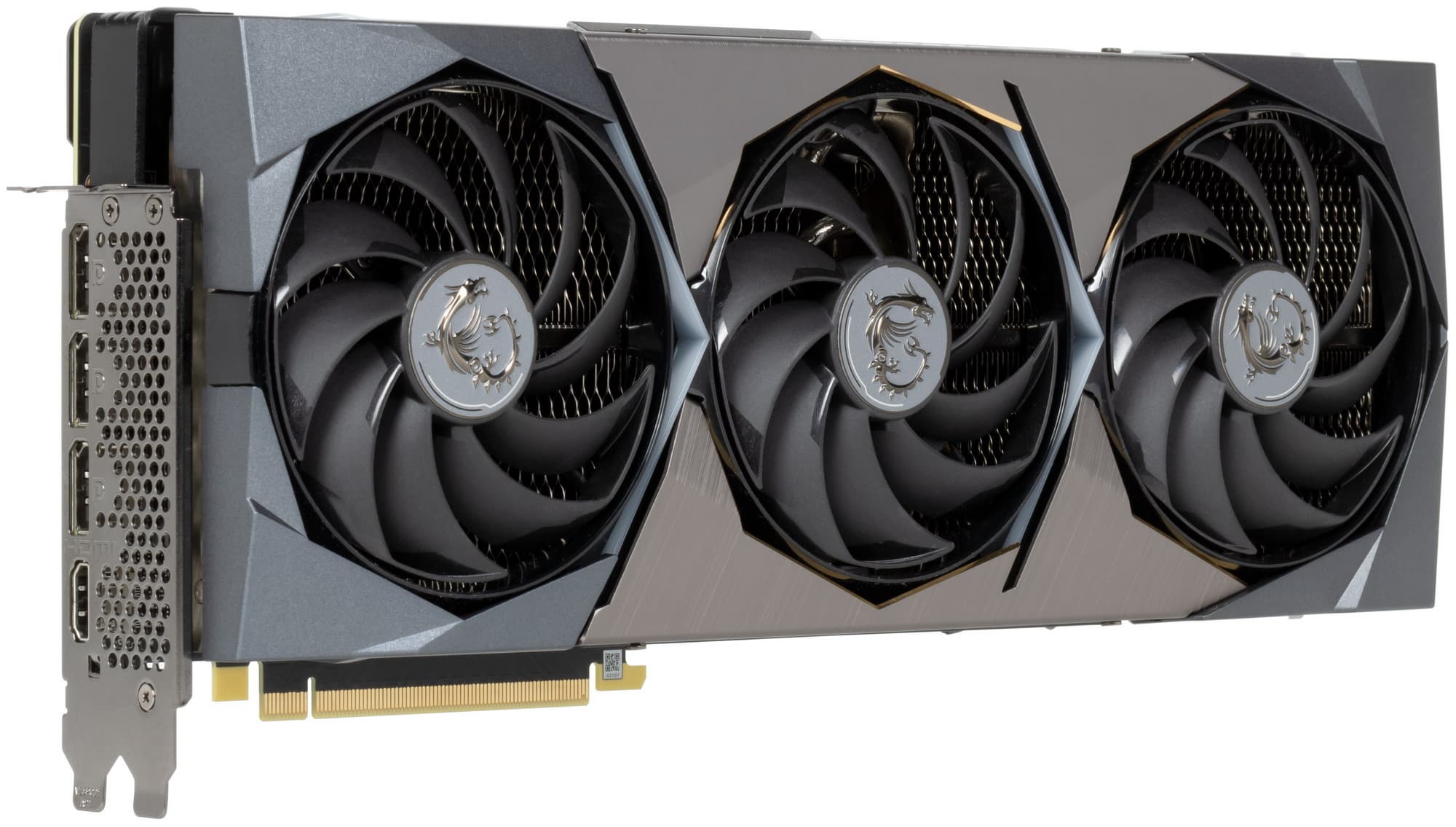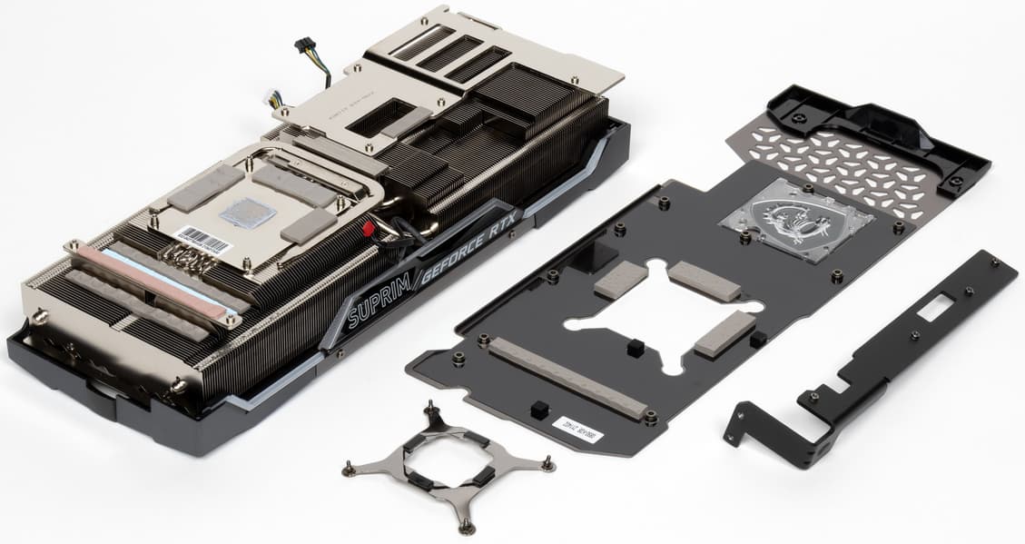 В Nvidia решили сделать у карт 30й серии более компактную PCB и придумали новую систему охлаждения, продувающую радиатор насквозь (при этом частично оставляющую нагретый воздух в объеме корпуса). Однако в MSI предпочли пойти старым проверенным путем, сделав PCB длиннее и установив кулер привычной конструкции. Поэтому перед нами огромный двухсекционный пластинчатый никелированный радиатор с тепловыми трубками, припаянными к никелированной подошве, контактирующей с GPU и микросхемами памяти (через термоинтерфейс). Форма ребер и концевые направляющие помогают рассеивать потоки нагретого воздуха.