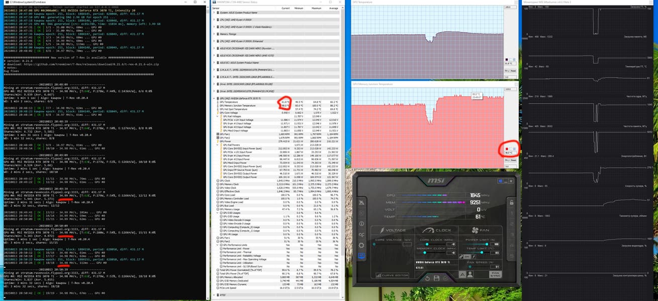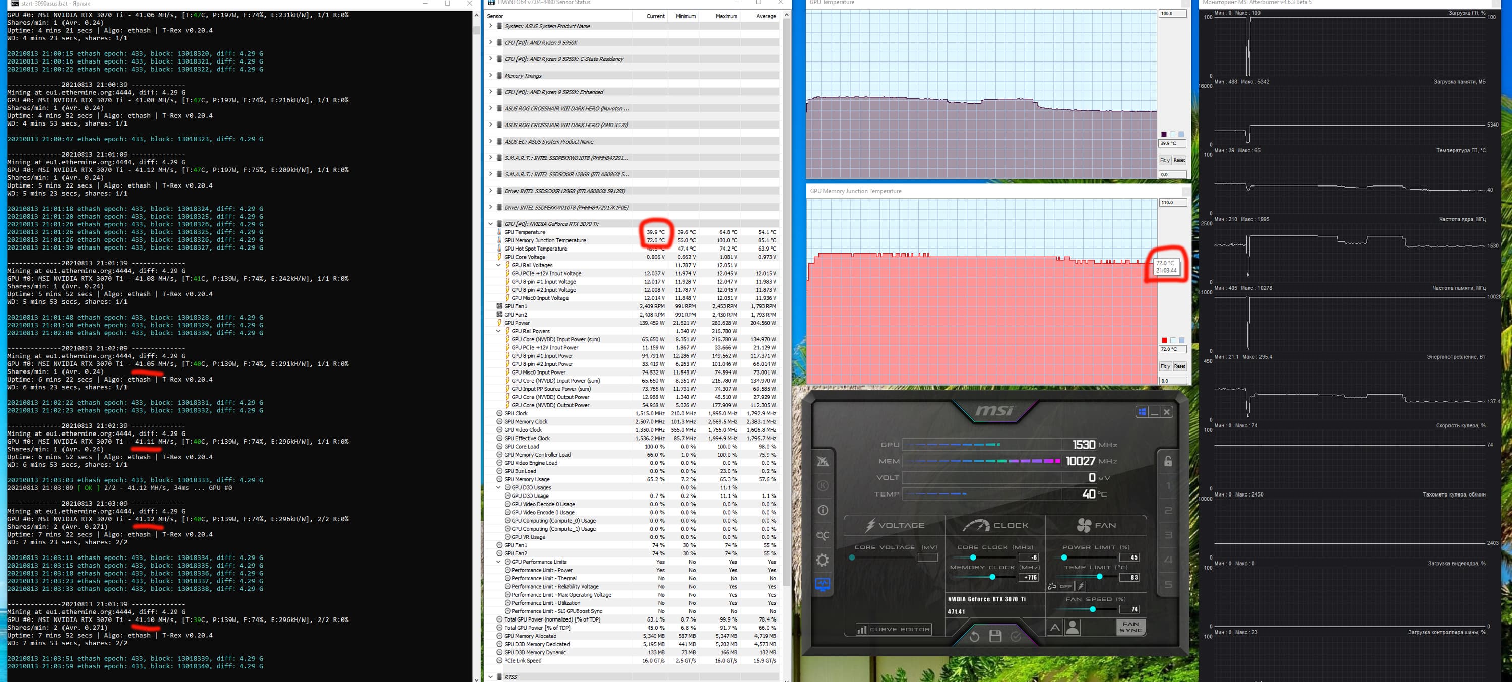 Оптимизация настроек работы видеокарт под майнинг в нашем случае не предусматривает сильного разгона видеопамяти, также обязательным является внешний обдув видеокарт. Особо тщательно надо следить за нагревом GDDR6X у GeForce RTX 3070Ti/3080/3080Ti/3090, ибо максимум для этой памяти — 110 градусов, и она долго не проживет, постоянно работая в условиях нагрева выше 100 °C. В нашем случае после оптимизации параметров работы карты и принудительного улучшения охлаждения нагрев памяти в майнинге по алгоритму ethash резко снизился до 72 градусов, так что в плане температурных показателей карта вполне годна для таких целей. Но все же не забываем, что выдает она низкий хэшрейт — около 41 MH/s, потребляя при этом весьма много — 139 Вт.