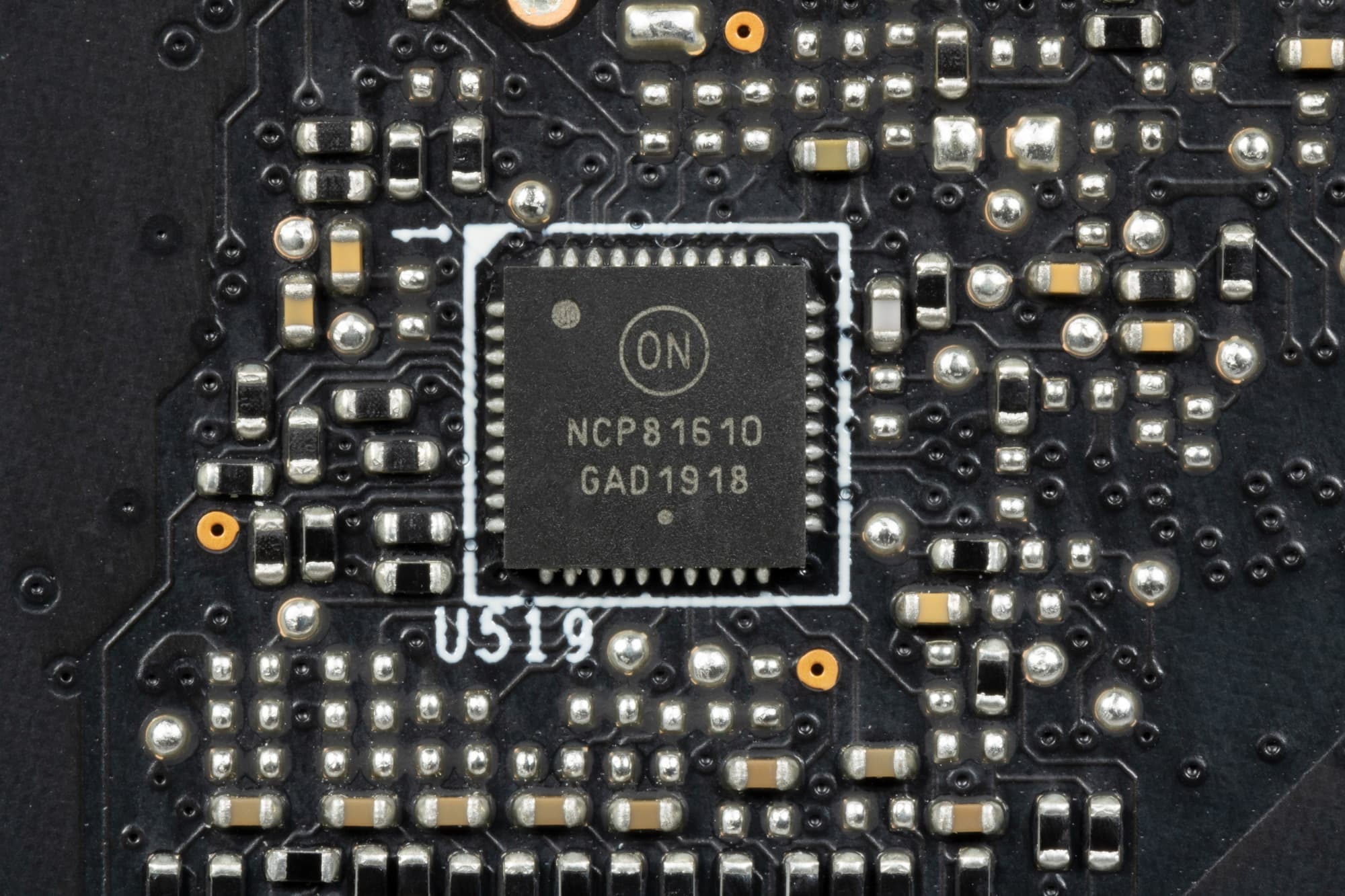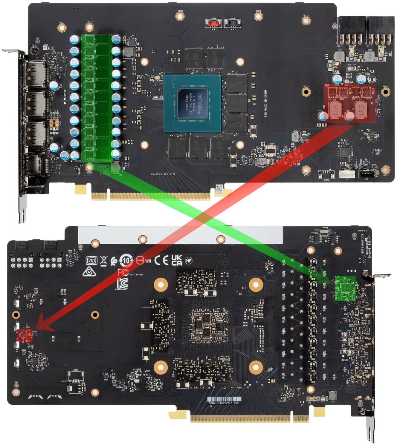 Зеленым цветом отмечена схема питания ядра, красным — памяти. За схему питания ядра отвечает ШИМ-контроллер On Semiconductor NCP81610, расположенный на оборотной стороне платы. Однако он умеет управлять максимум 8 фазами, поэтому, по всей видимости, часть фаз (из 11) управляется параллельно.