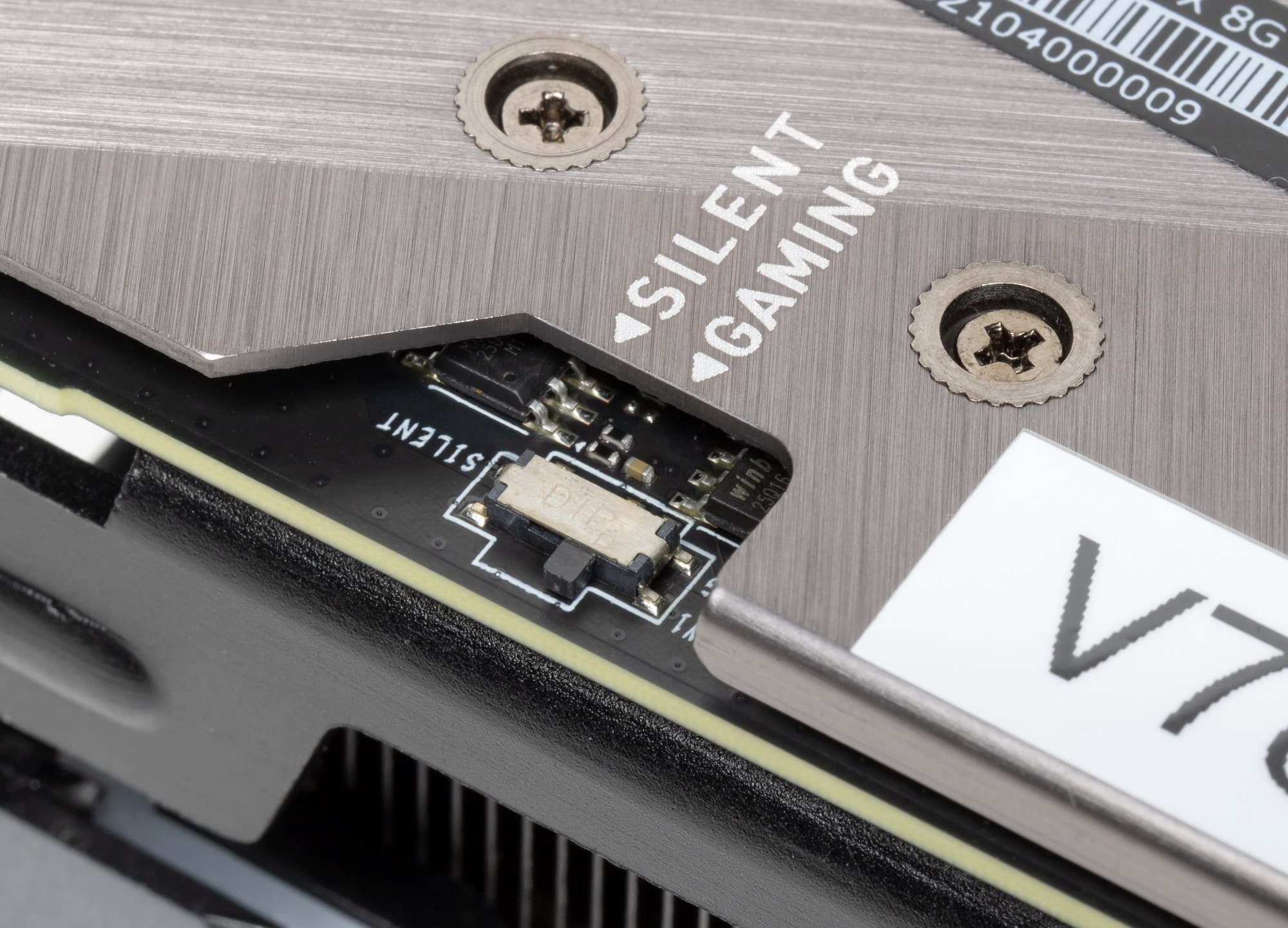 Карта имеет два режима работы, они заложены в двух вариантах BIOS, которые переключаются на верхнем торце карты: Gaming и Silent. Разница между режимами заключается лишь в оборотах вентиляторов, а Boost-частоты GPU и частоты памяти одинаковые.