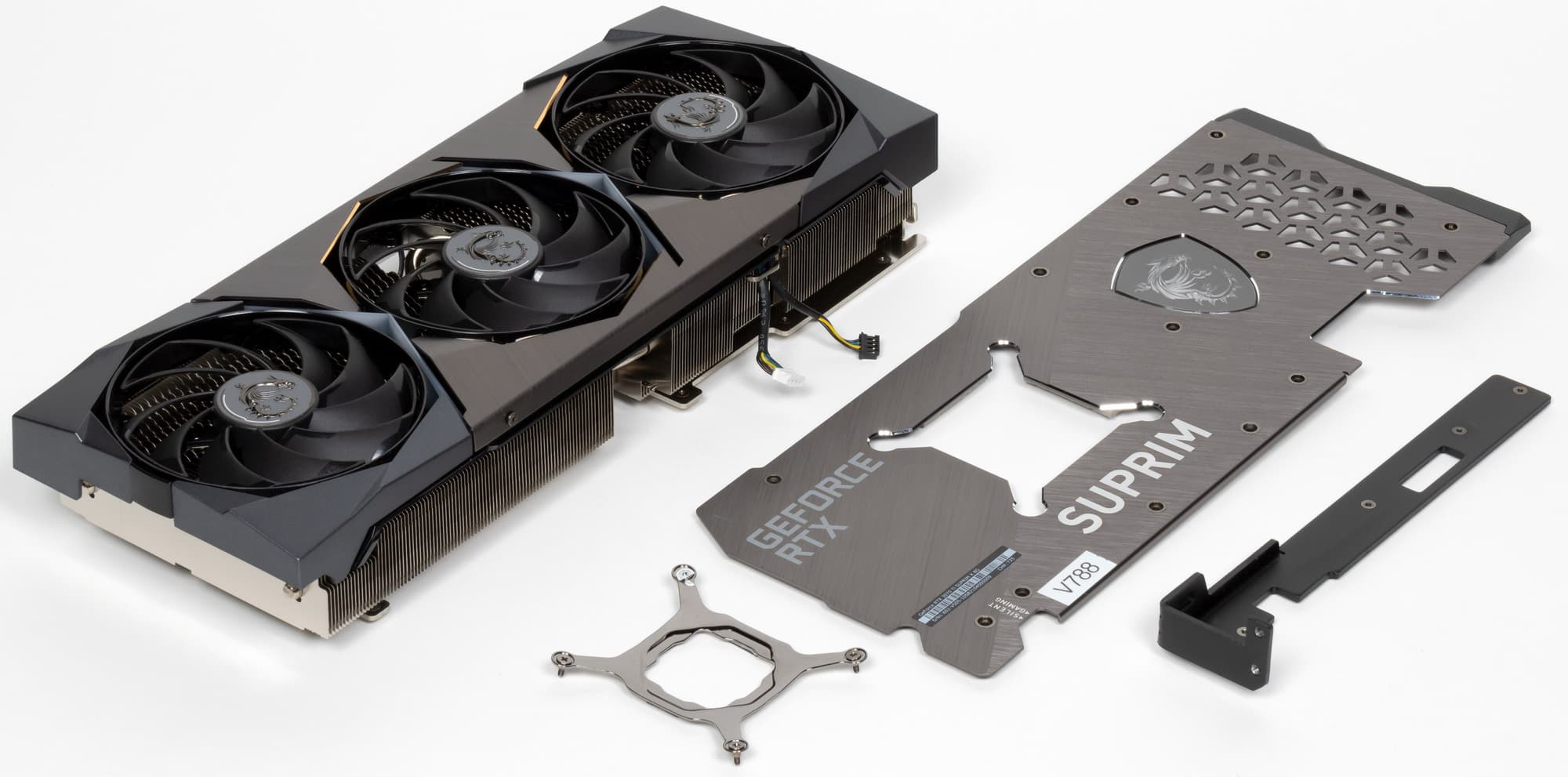Если раньше компания MSI со своими массивными топовыми видеокартами поставляла металлические кронштейны, то в данном случае решено изменить вид подставки на штатив, упирающийся в дно корпуса.