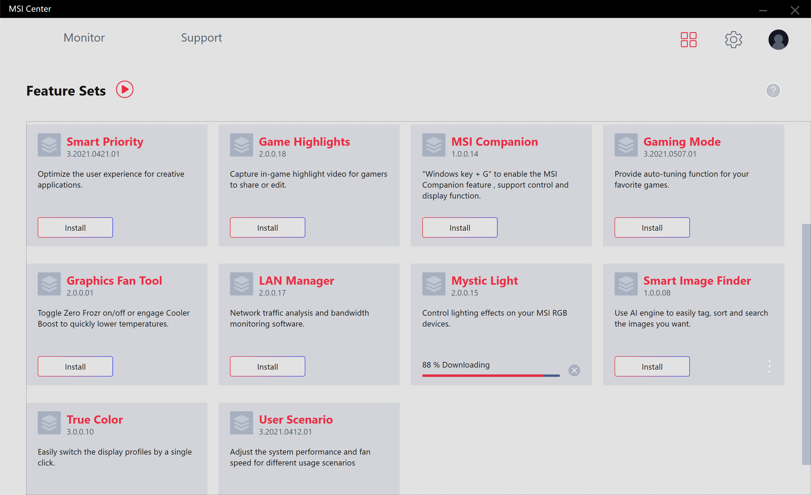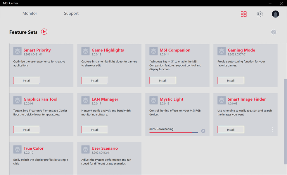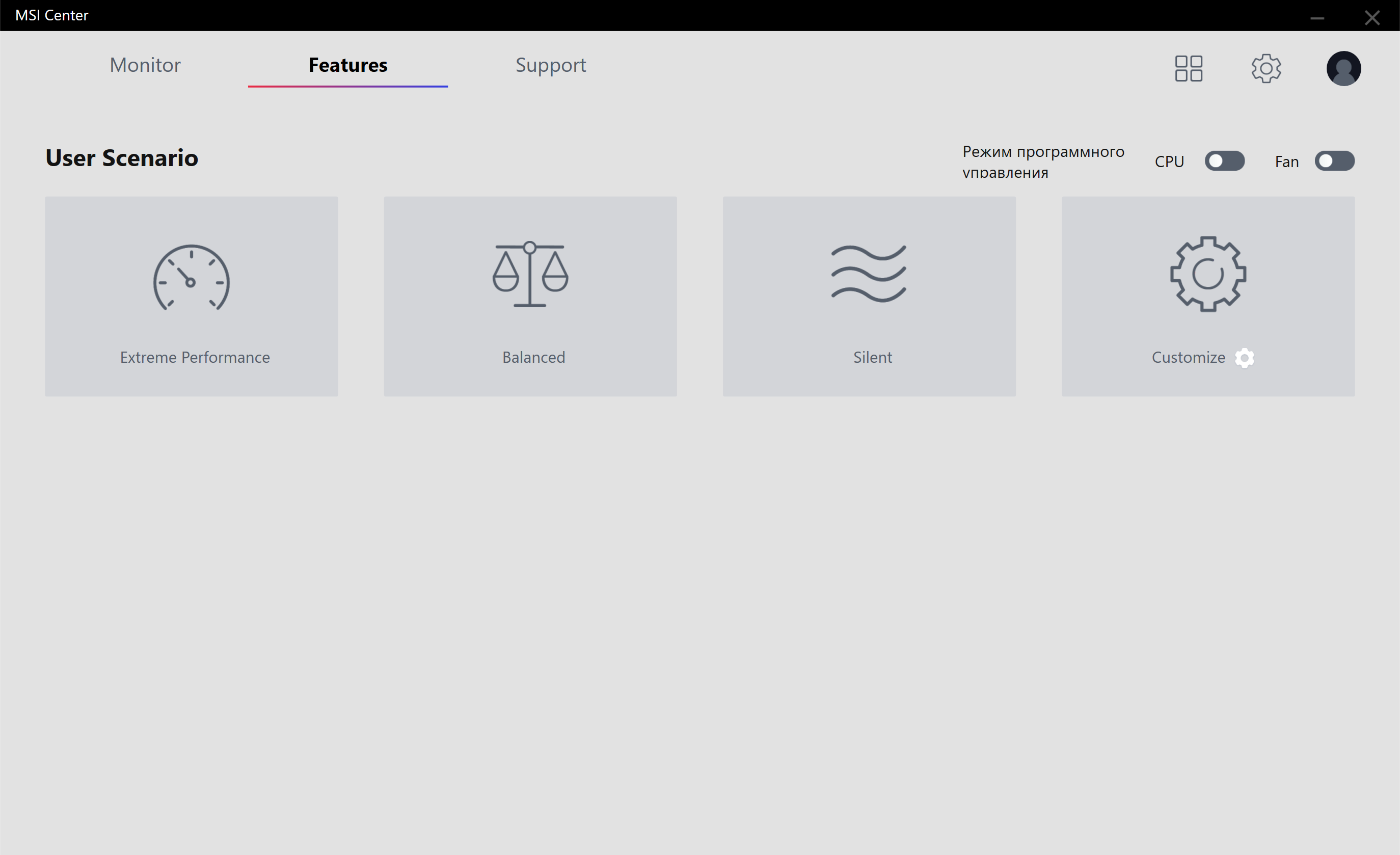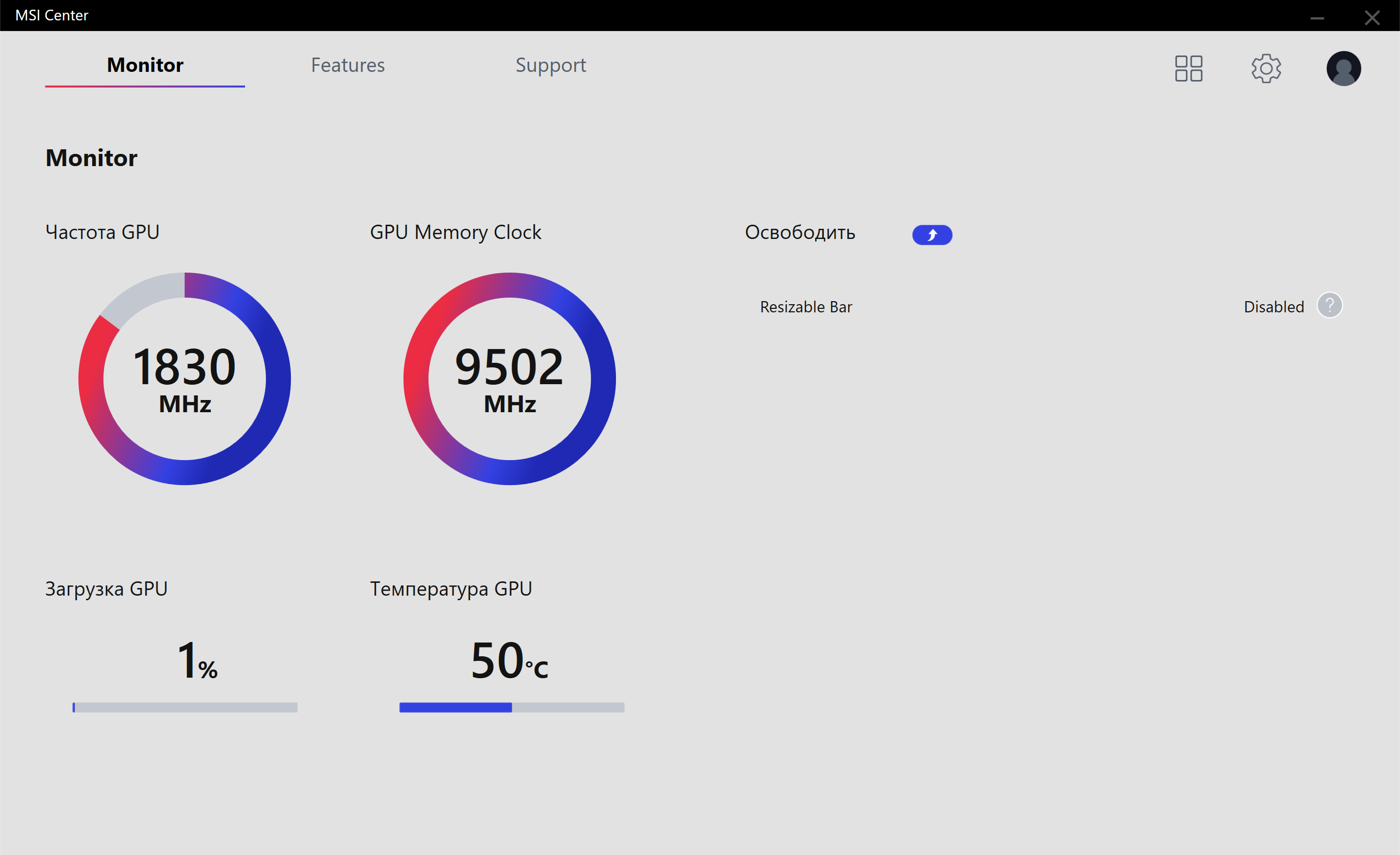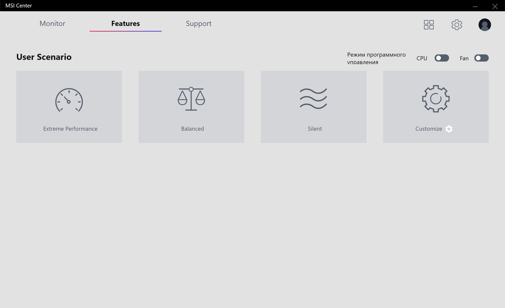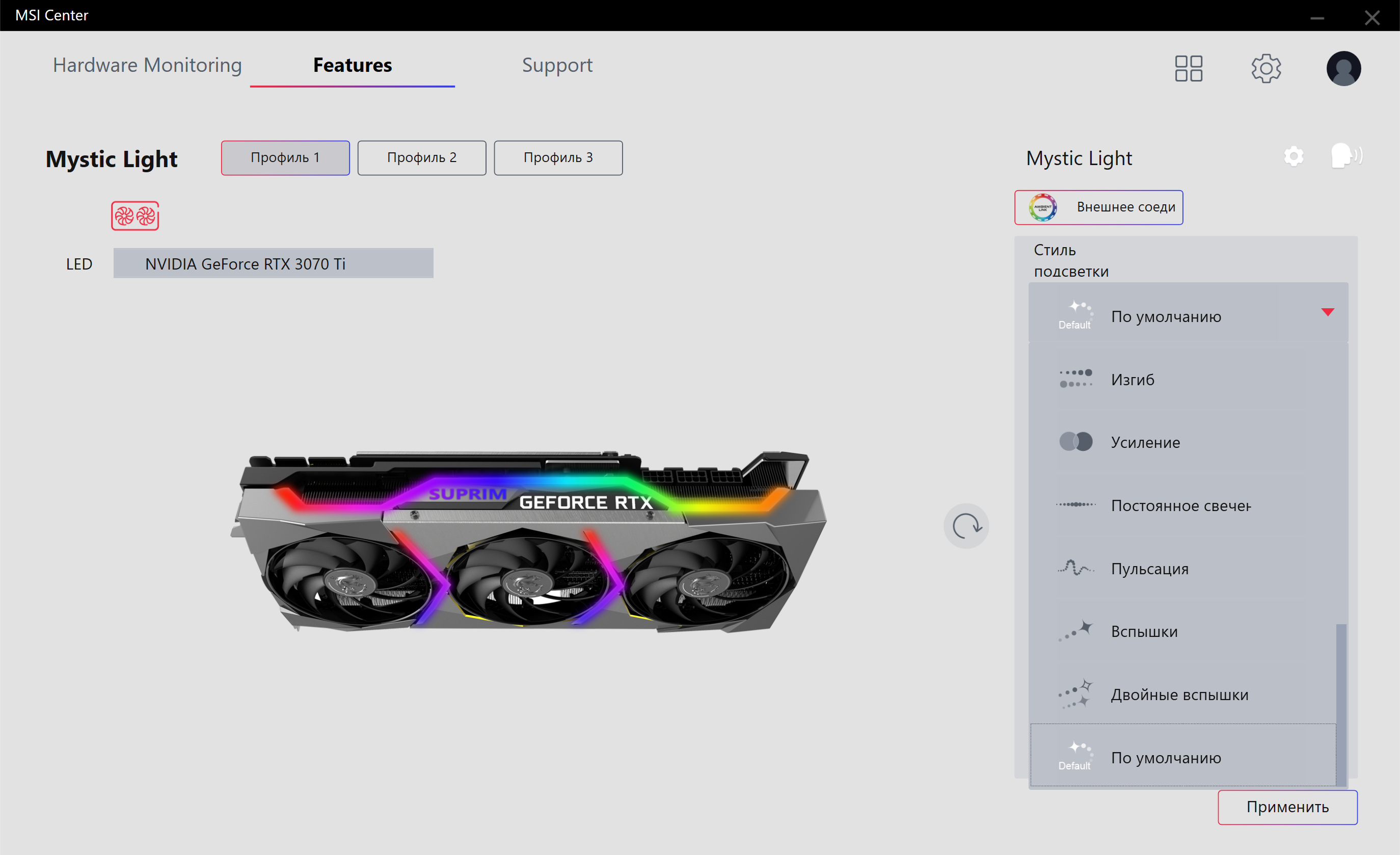 Управление работой карты обеспечивается с помощью фирменной утилиты MSI Center. Эта программа относительно недавно заменила собой прежний Dragon Center и является универсальным средством для огромного ассортимента продуктов MSI, включая не только видеокарты и материнские платы, но также и СЖО и ноутбуки.