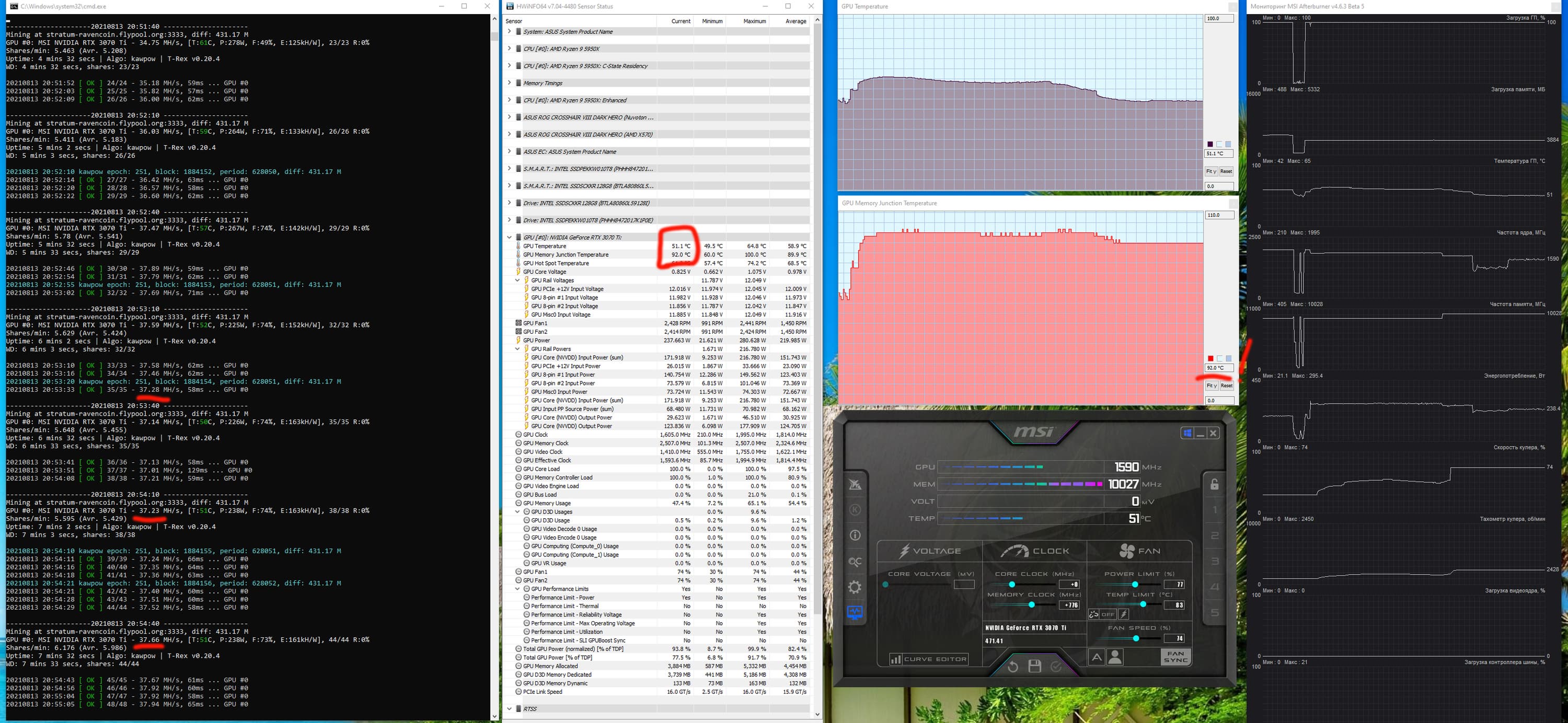 А вот хэшрейт по RVN ожидаемый (пропорциональный теоретическим возможностям ускорителя), так что в данном случае защита от майнинга не работает (также проверялось на альткойне ERGO). Соответственно, «защищена» карта, только пока основным алгоритмом майнинга остается ethash. Следует особо отметить, что алгоритм kawpow запрашивает более высокого энергопотребления, чем ethash. Поэтому нагрев выше, чем в предыдущем случае. 3070 Ti в майнинге RVN показал хэшрейт между RX 6900 XT и RTX 3080. НО! Нагрев памяти карты сразу же при запуске майнинга достиг 98 градусов, что является уже некоторым тревожным сигналом. Впрочем, не забываем, что это запуск по умолчанию.