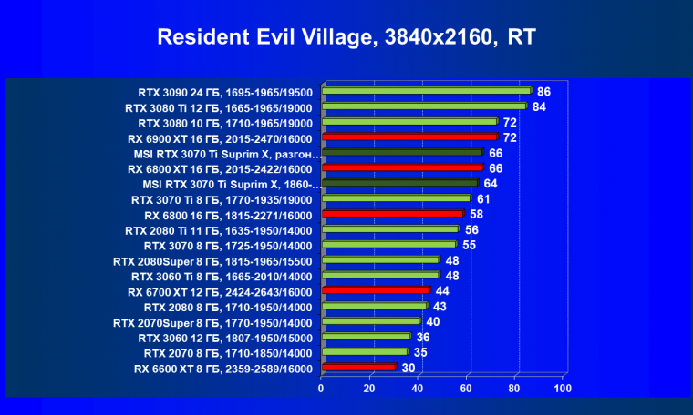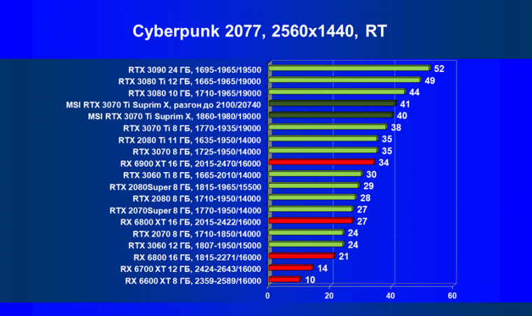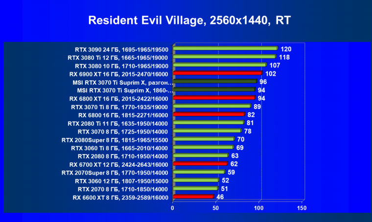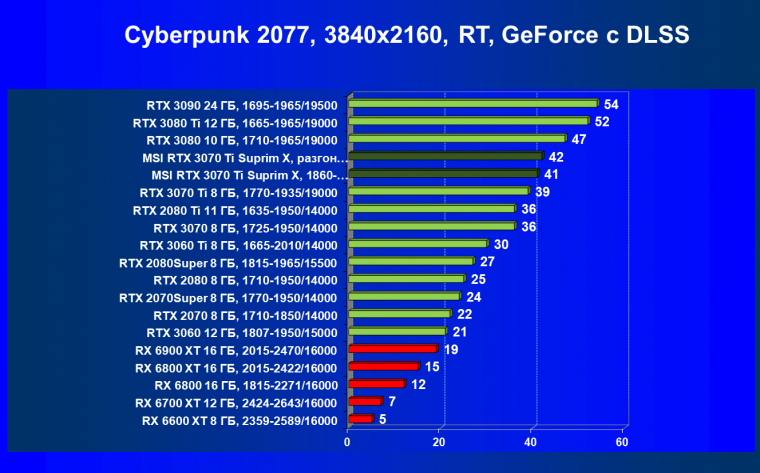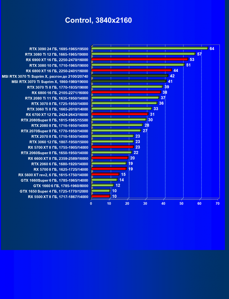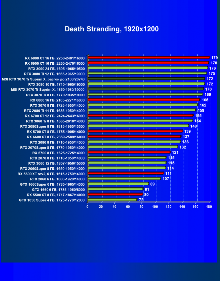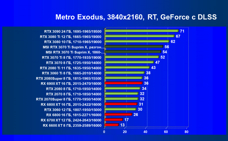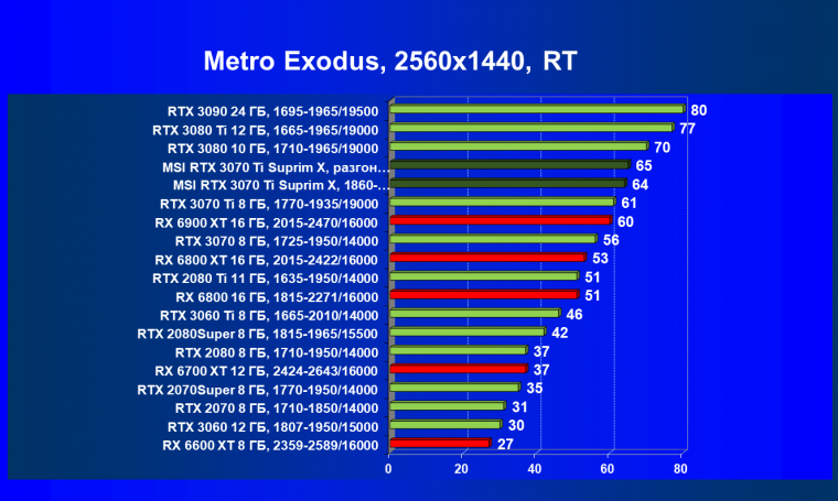 Из-за сильного падения производительности в играх с трассировкой лучей все семейство Radeon RX 6000 оказалось в аутсайдерах, так что RTX 3070 Ti лидирует в группе.