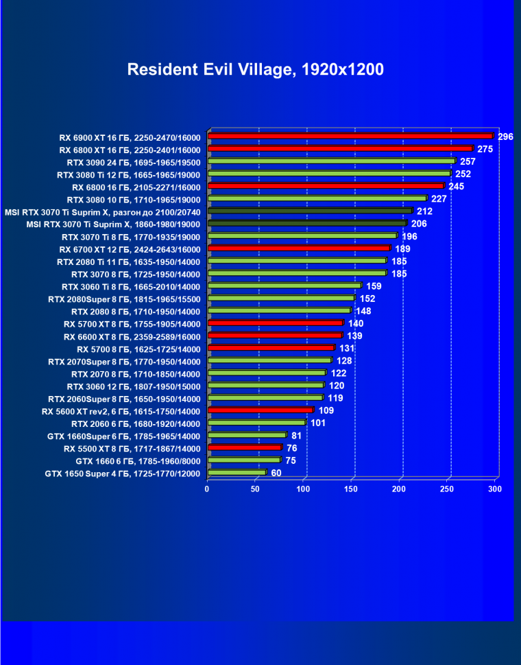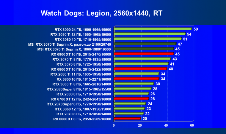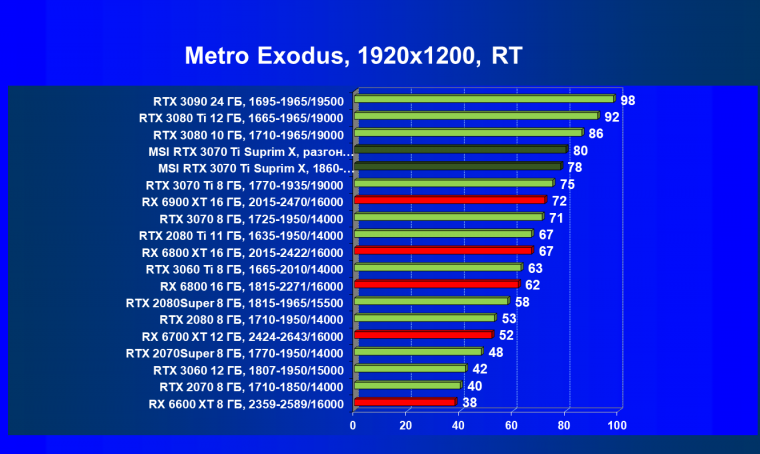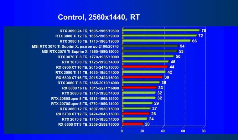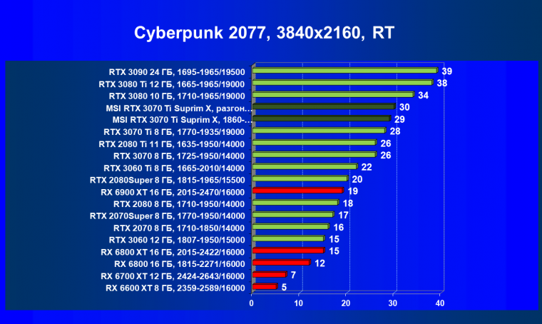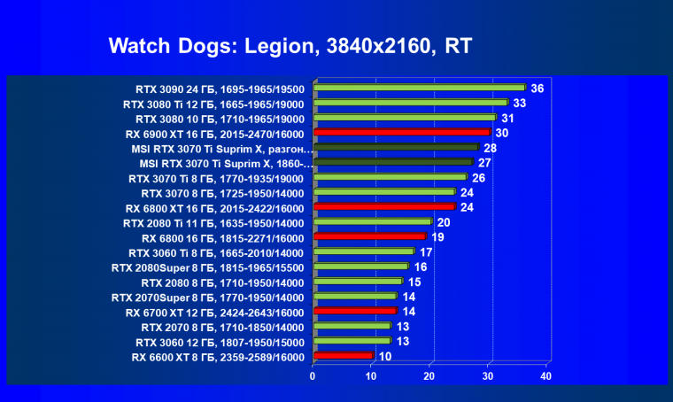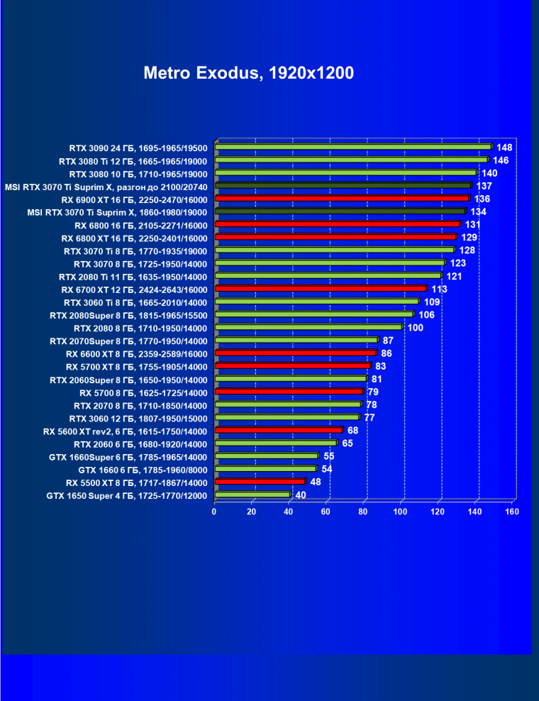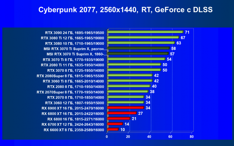 Из-за сильного падения производительности в играх с трассировкой лучей все семейство Radeon RX 6000 оказалось в аутсайдерах, так что RTX 3070 Ti лидирует в группе.