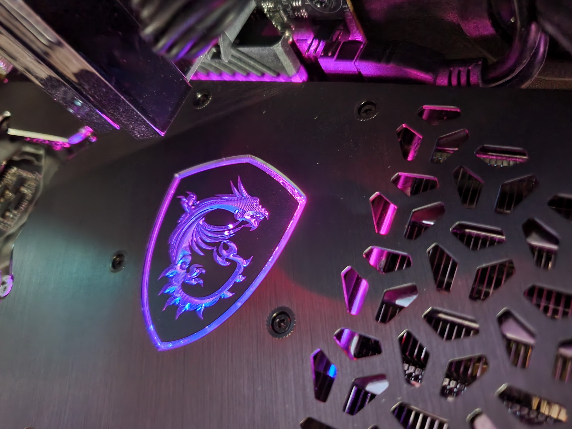 Подсветка у карты реализована в ломаных полосах вдоль верхнего торца карты, логотипах на том же торце, а также вставках между вентиляторами. Подсветка явно предназначена в первую очередь для тех, кто используют видеокарту в традиционной горизонтальной ориентации (вставленной в слот на материнской плате).