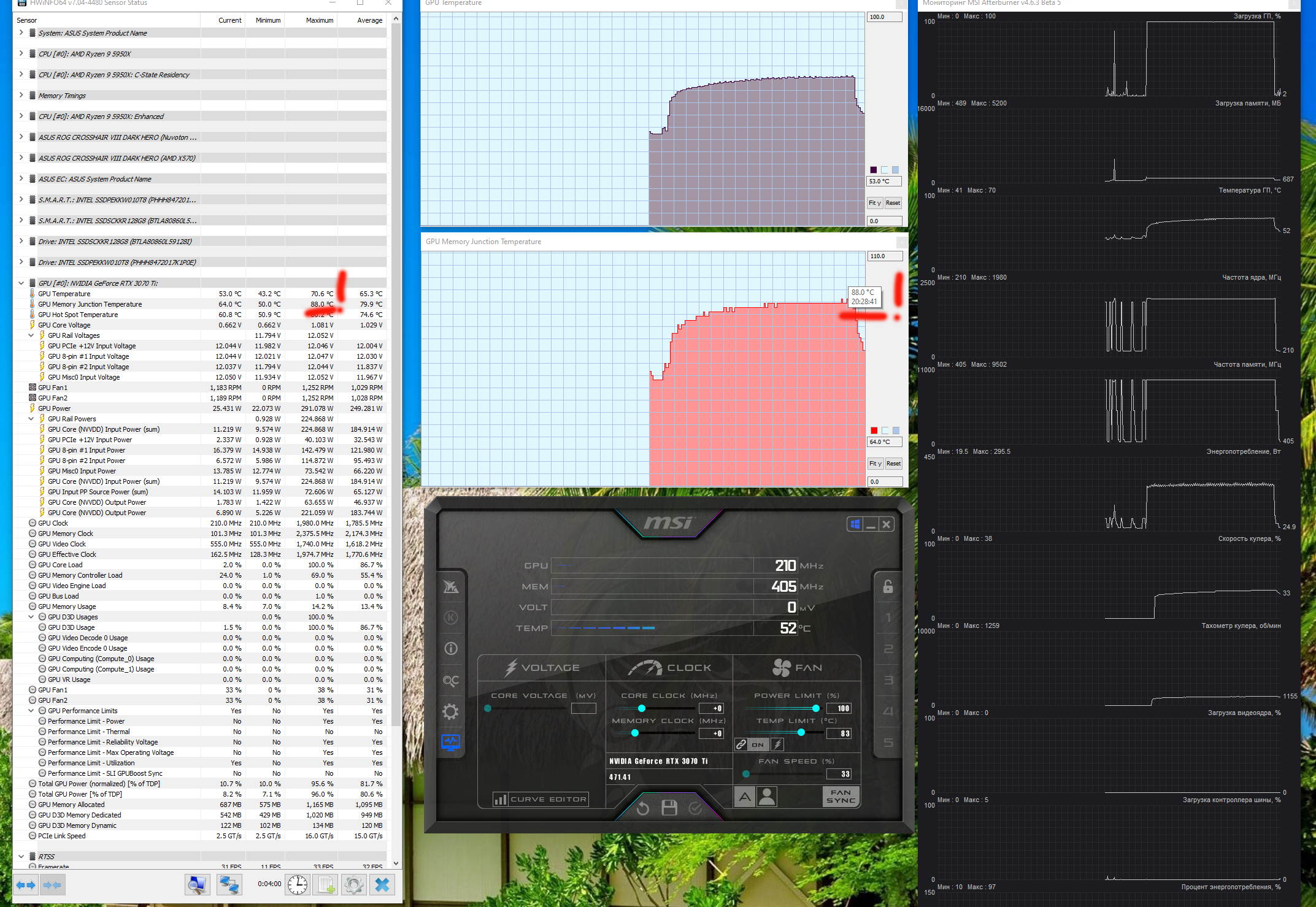 Если мы запускаем майнинг ETH с установками параметров работы карты по умолчанию, то температура нагрева памяти на карте поднимается до 88 градусов, что является приемлемым результатом.