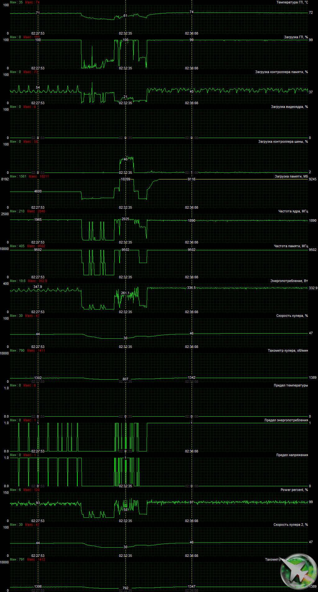 После 6-часового прогона под нагрузкой максимальная температура ядра не превысила 74 градусов, что является как минимум нормальным результатом для видеокарт топового уровня.