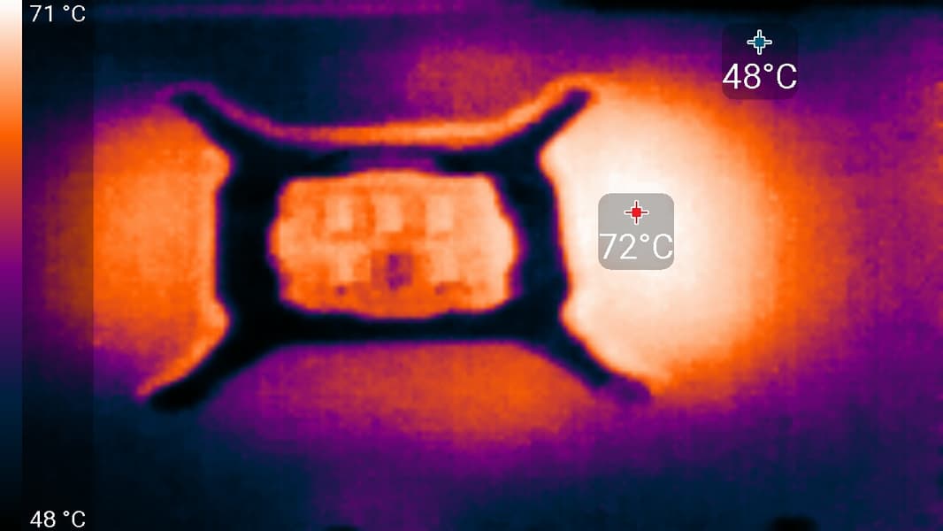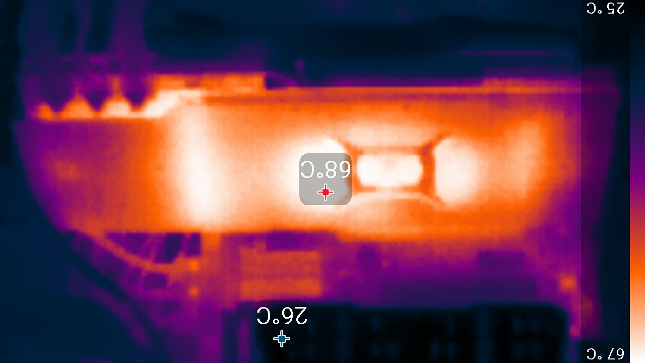 Максимальный нагрев наблюдался в центральной части PCB, в основном около ядра (и основным источником нагрева является память). Но также стоит обратить внимание на три разъема питания: все они весьма сильно нагреваются, особенно тот, что ближе к центру платы.