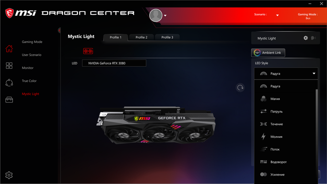 Управление работой карты обеспечивается с помощью хорошо известной фирменной утилиты MSI Dragon Center. К сожалению, на момент подготовки обзора последняя версия Dragon Center работала с картами нового семейства GeForce RTX 30 с проблемами, наблюдались вылеты программы, отсутствовала часть функциональности. Ждем обновления ПО.