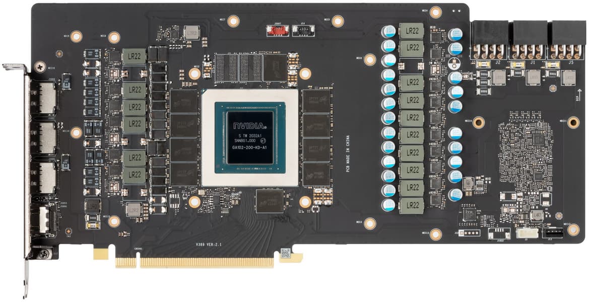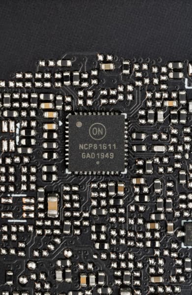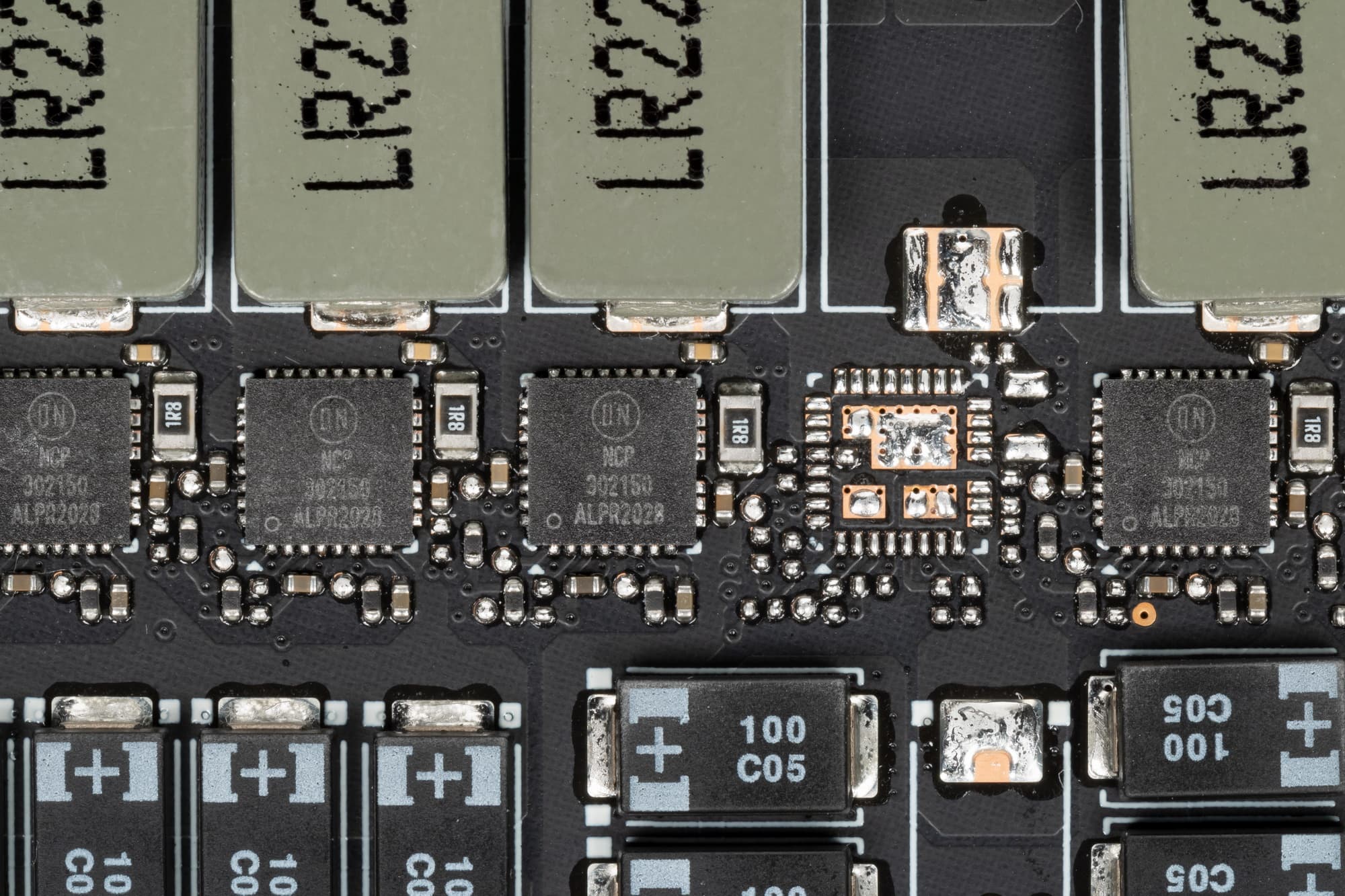 В преобразователе питания, традиционно для всех видеокарт Nvidia, используются транзисторные сборки DrMOS — в данном случае NCP302150 (On Semiconductor), каждая из который рассчитана максимально на 50 А (суммарно система питания способна «переварить» до 800 А, и понятно, что даже GeForce RTX 3090 с ее 24 микросхемами GDDR6X не дотянет до таких величин).