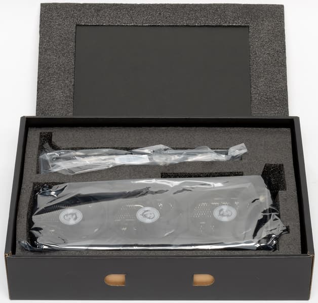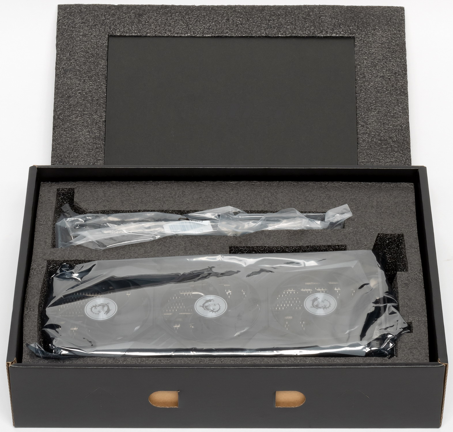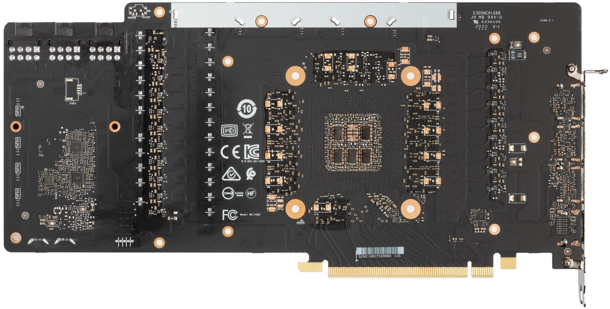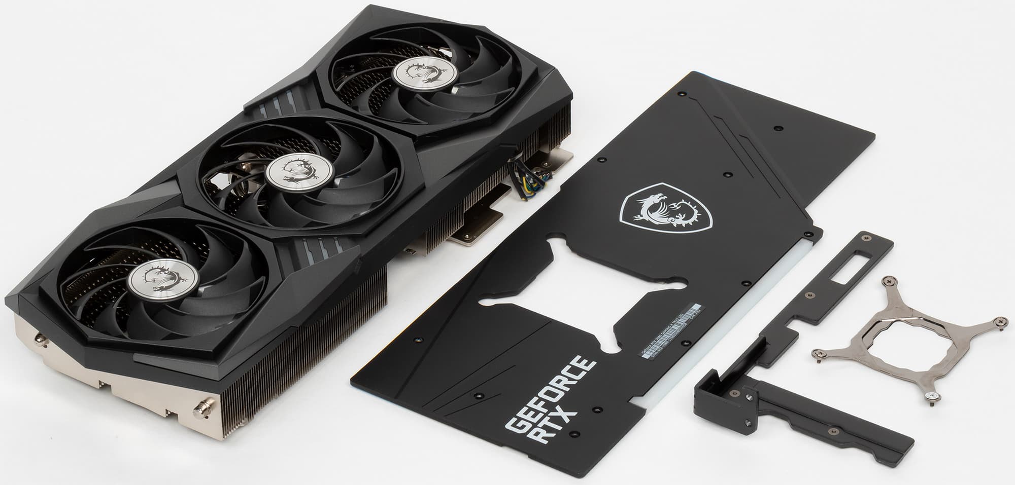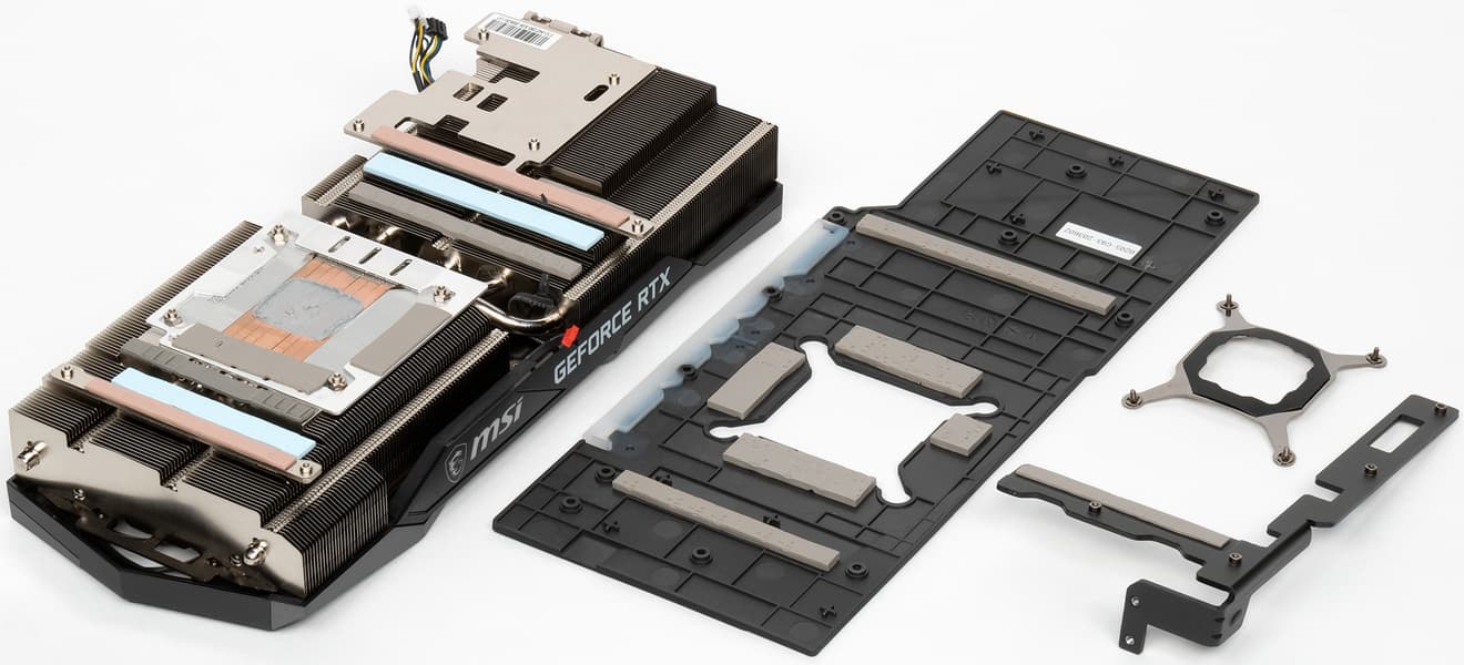 Напомним, что в Nvidia решили сделать PCB более компактной: для новых карт создана специальная система охлаждения, продувающая радиатор насквозь и частично оставляющая нагретый воздух в объеме корпуса. Однако в MSI решили пойти более традиционным путем, сделав PCB длиннее и установив кулер привычной конструкции. Мы видим большой двухсекционный пластинчатый никелированный радиатор с тепловыми трубками, формирующими подошву прямого контакта с GPU. Микросхемы памяти охлаждаются пластиной, прикрученной к основанию радиатора, а преобразователи питания VRM охлаждаются с помощью отдельных пластин, прикрученных уже к ребрам обеих секций радиатора (одна из этих пластин служит еще и ребром жесткости). Задняя пластина служит не только элементом защиты PCB, но и участвует в охлаждении оборотной стороны платы через термоинтерфейс.