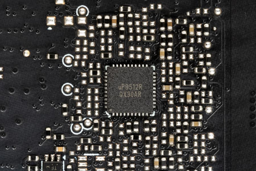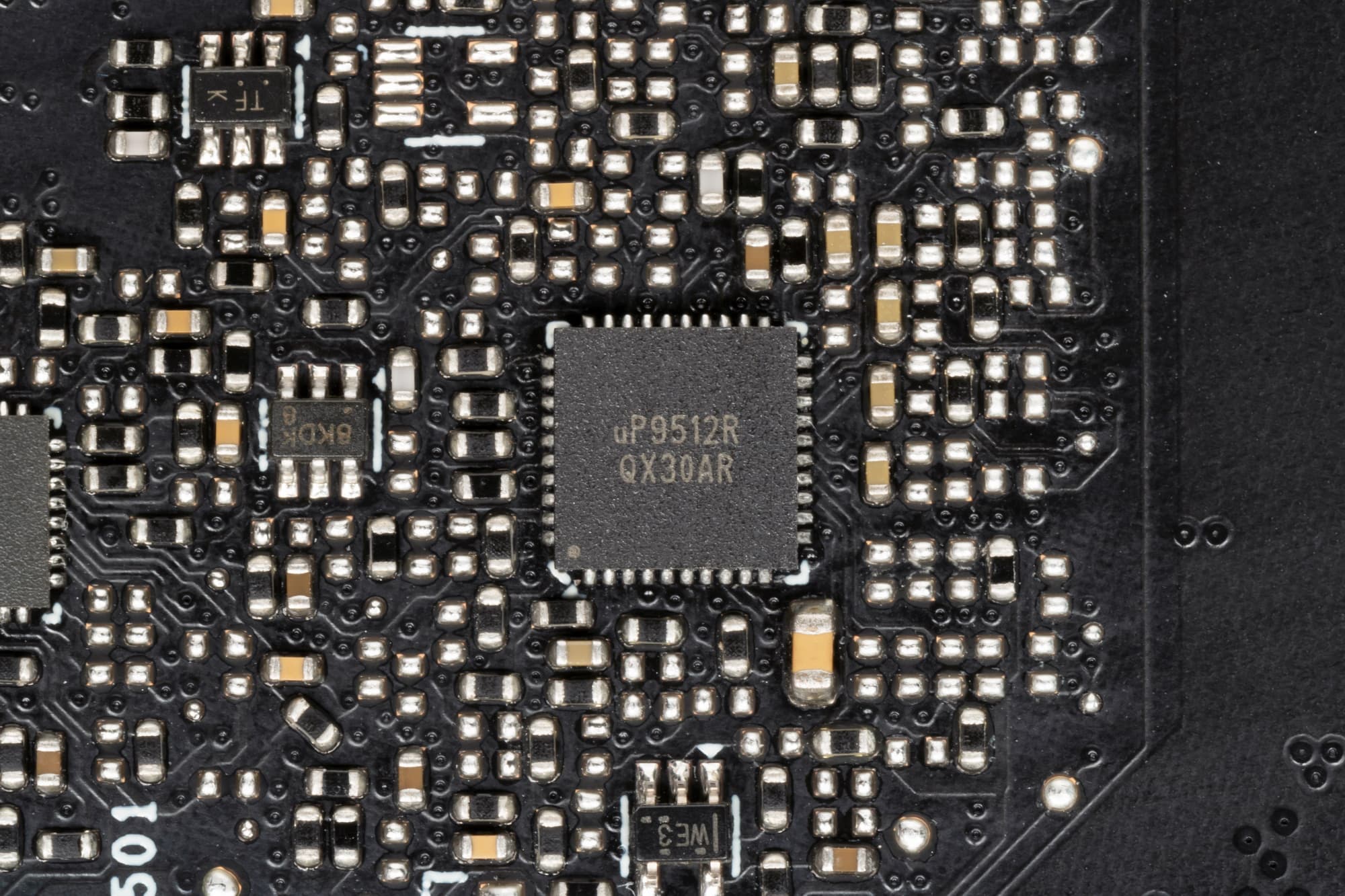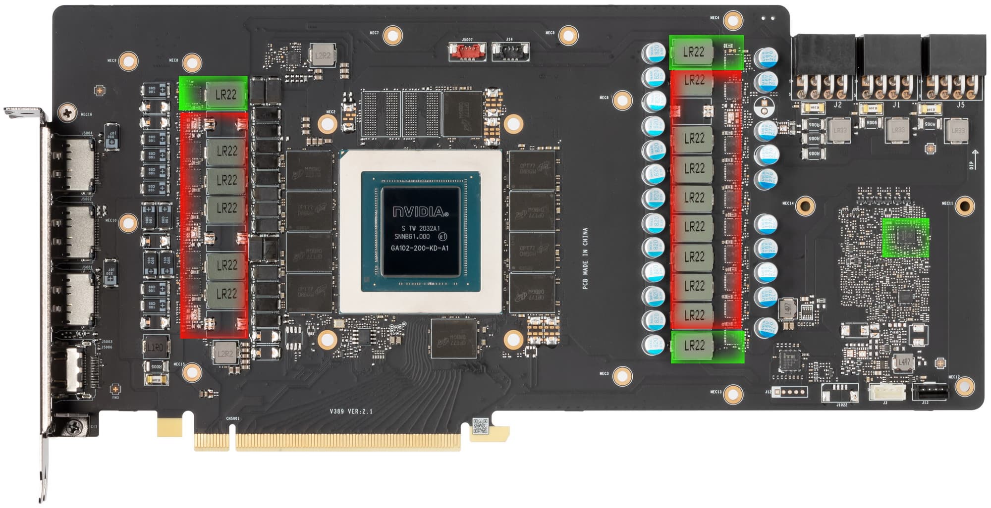 Зеленым цветом отмечена схема питания памяти, красным — ядра. При этом никаких удвоителей (даблеров) фаз нет, для управления схемой питания GPU используются два ШИМ-контроллера uP9512R (uPI Semiconductor), каждый из которых способен управлять 8 фазами максимум. Оба расположены на оборотной стороне платы.
