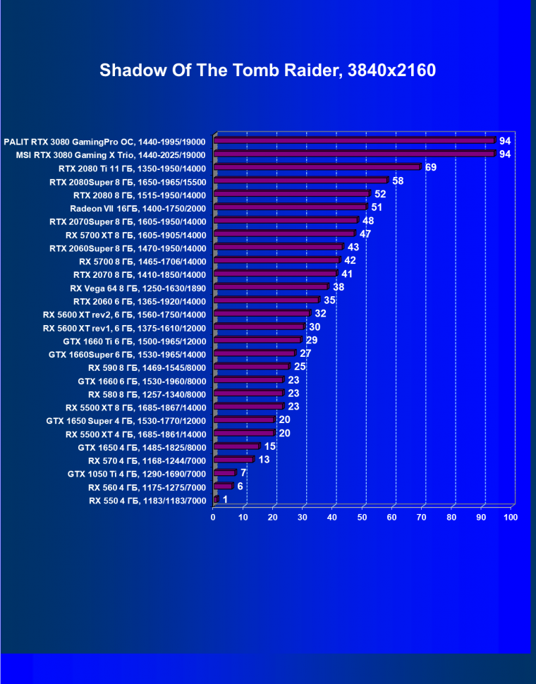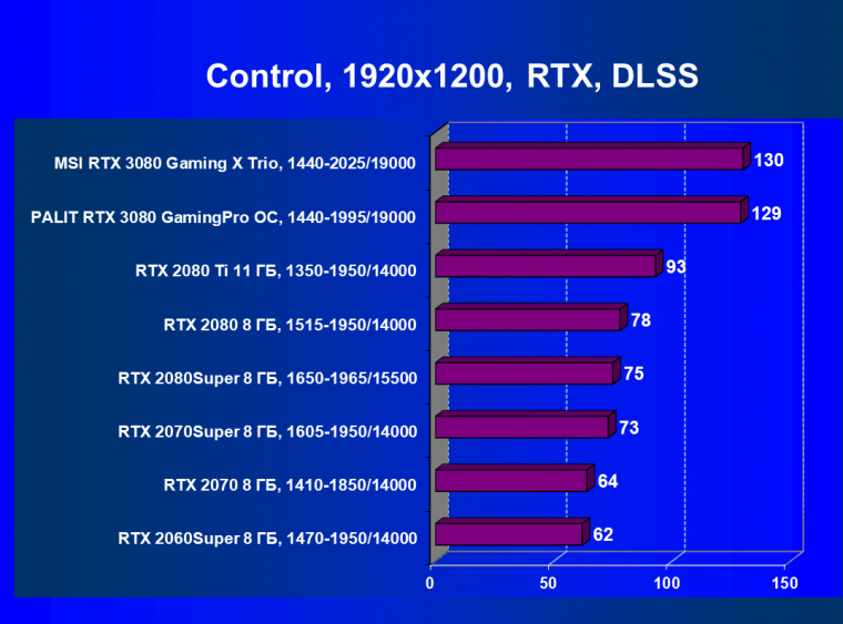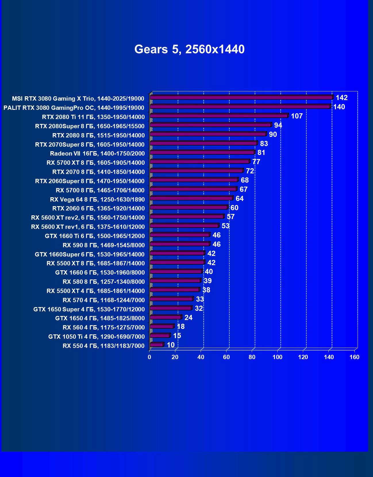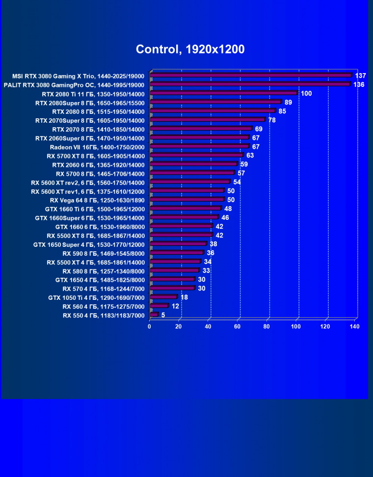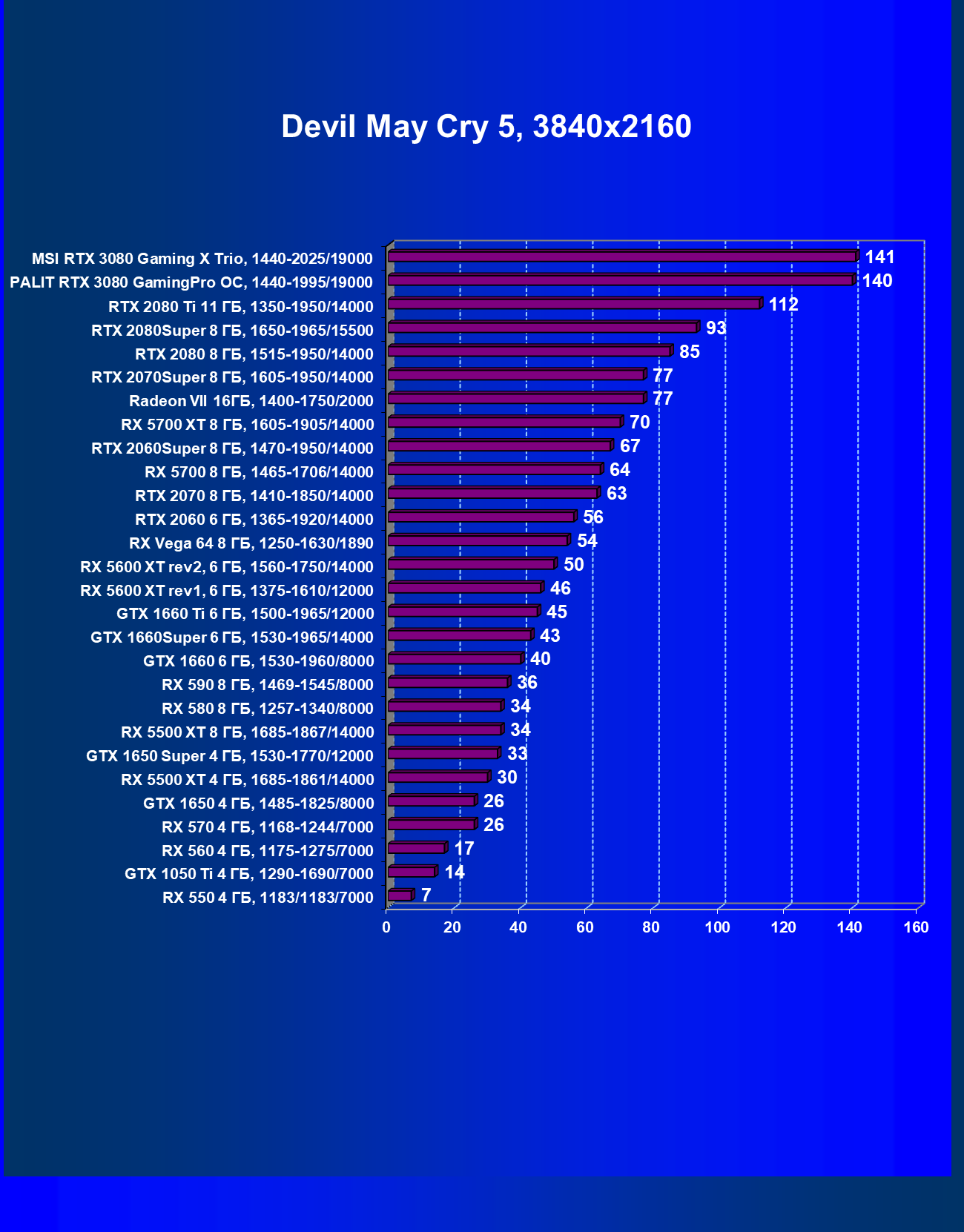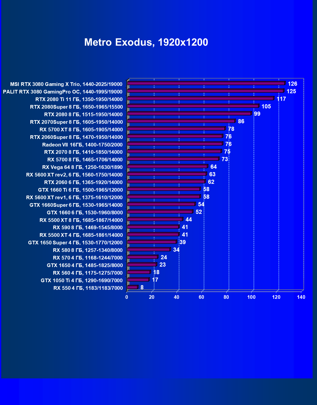 Полагаем, что комментарии излишни: лидер — он и есть лидер. Конечно, мы не сбрасываем со счетов GeForce RTX 3090, однако этот ускоритель не является чисто игровым и стоить должен, по первым прикидкам, еще вдвое дороже, поэтому напрямую их сравнивать тяжело.