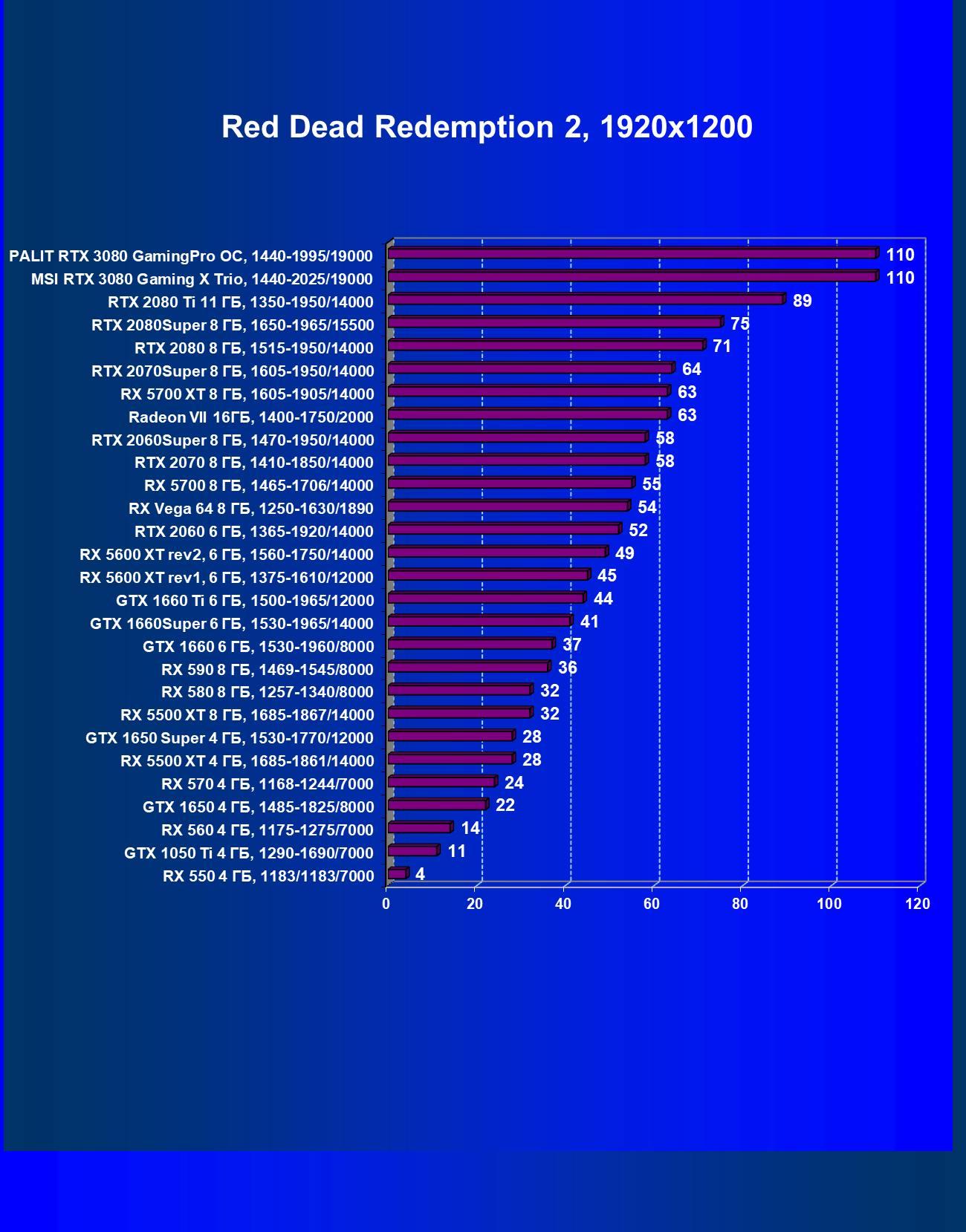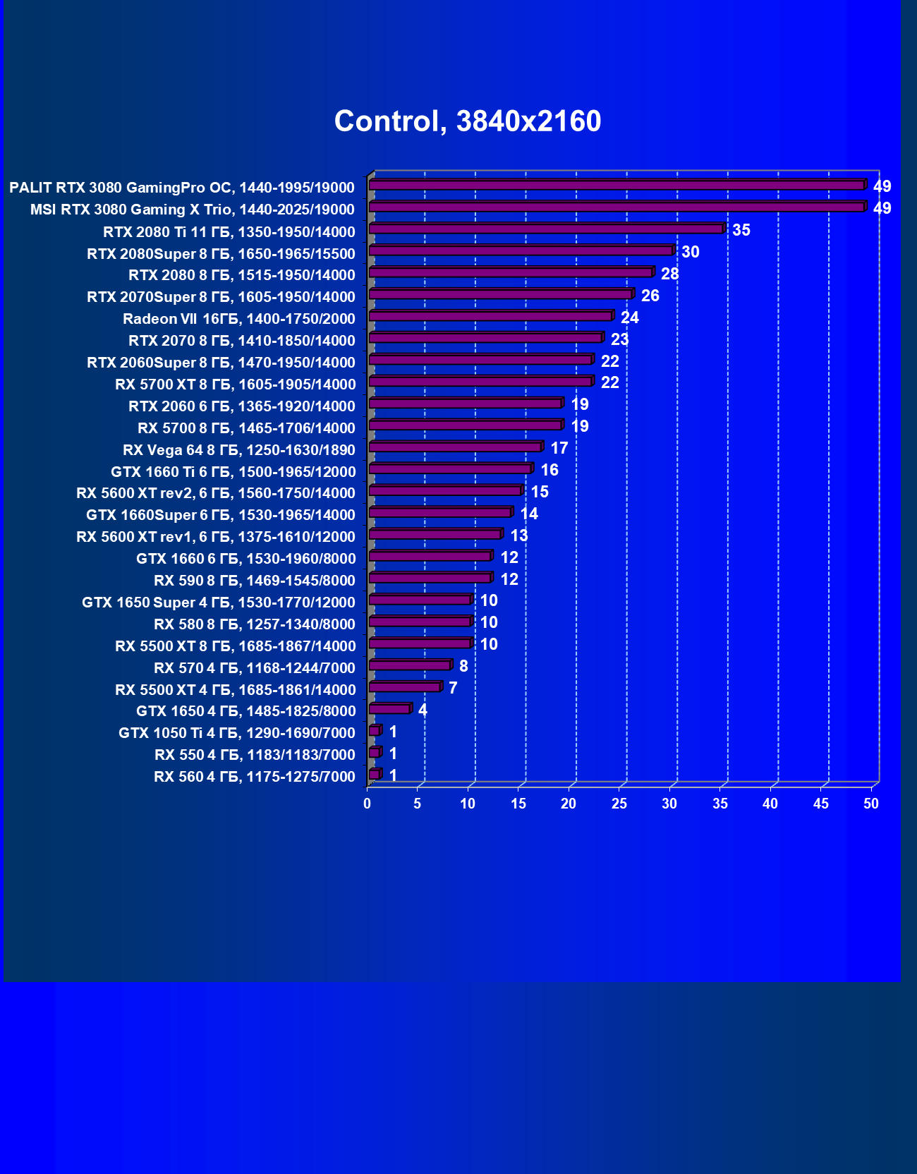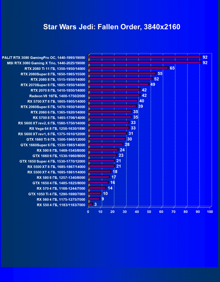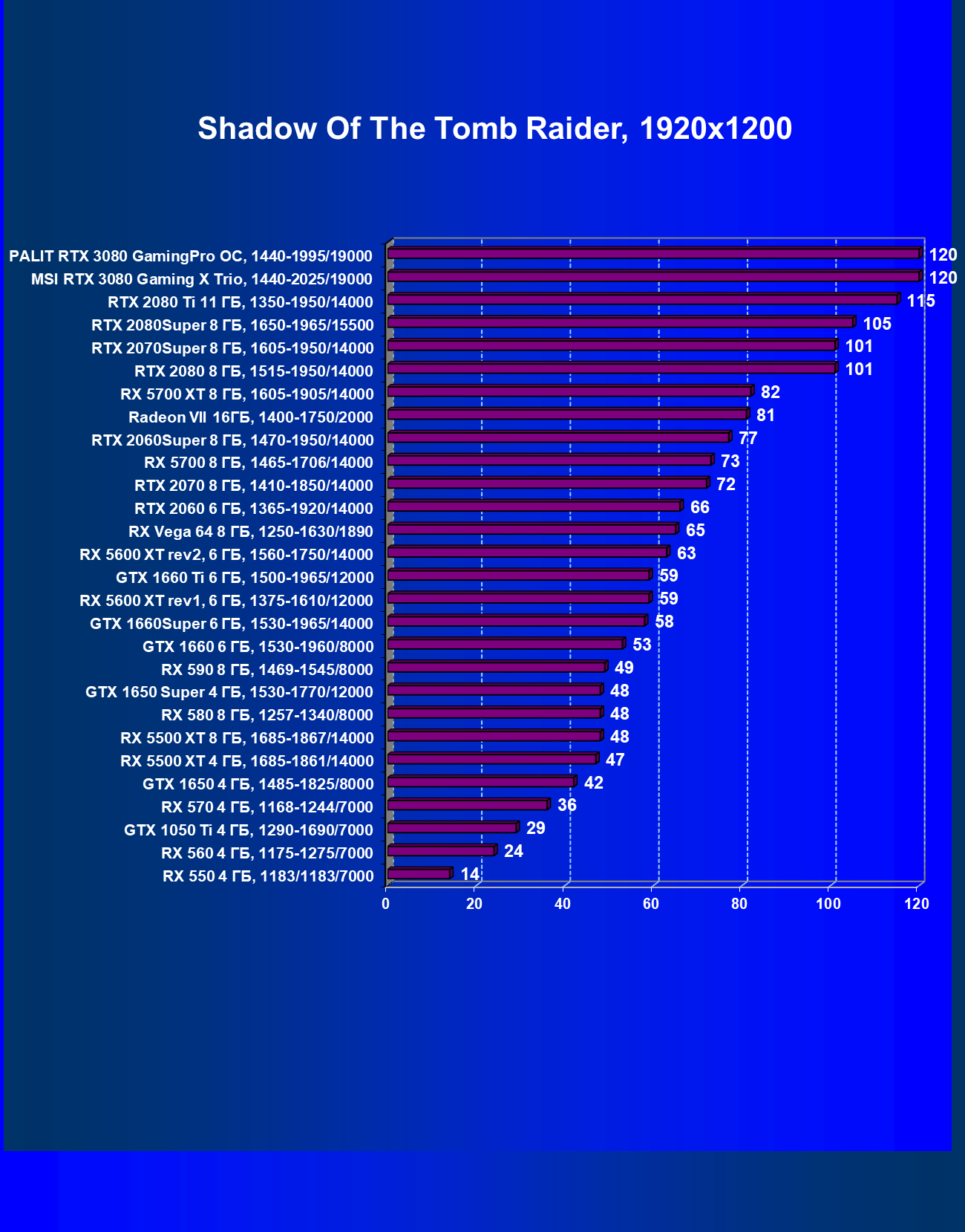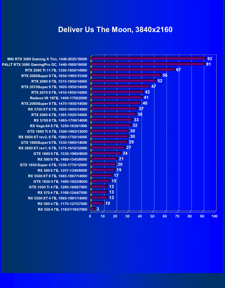 Полагаем, что комментарии излишни: лидер — он и есть лидер. Конечно, мы не сбрасываем со счетов GeForce RTX 3090, однако этот ускоритель не является чисто игровым и стоить должен, по первым прикидкам, еще вдвое дороже, поэтому напрямую их сравнивать тяжело.