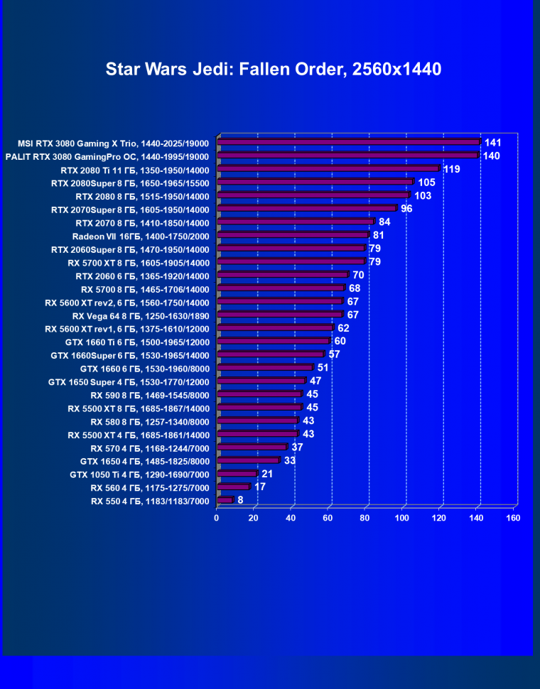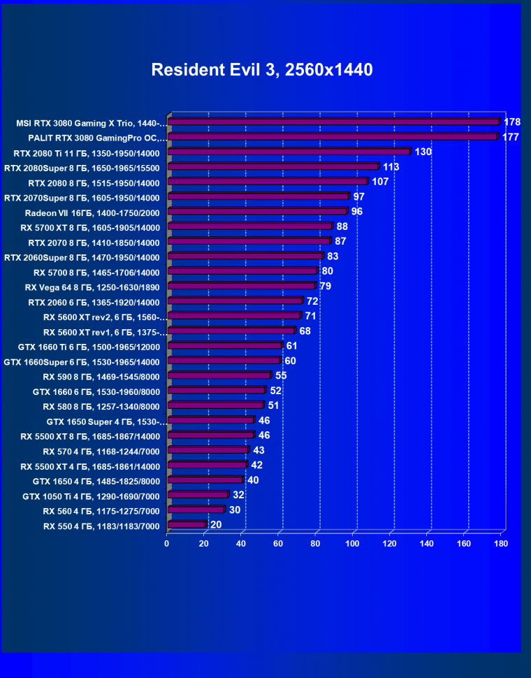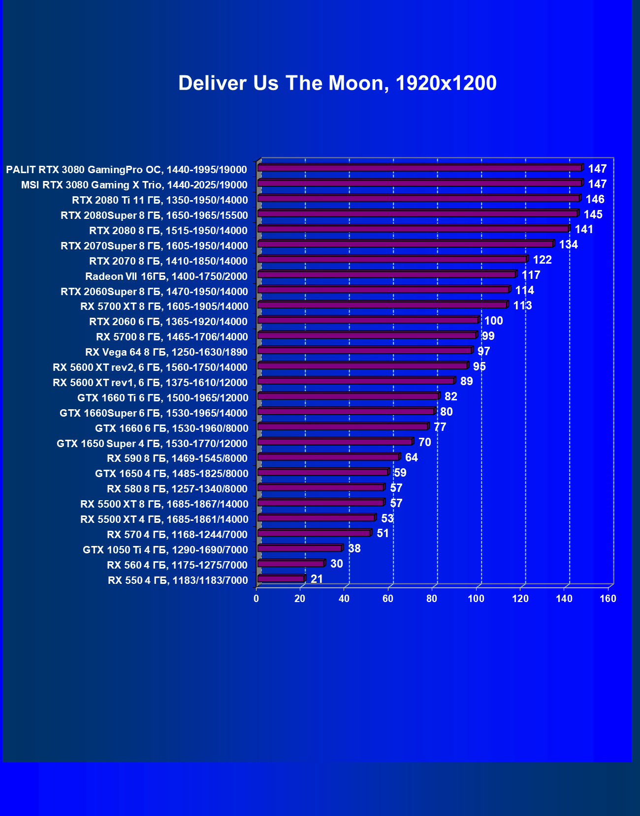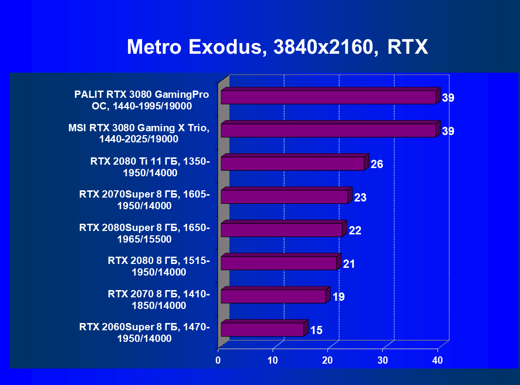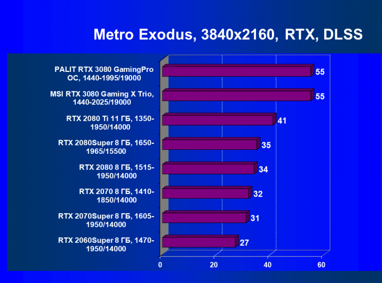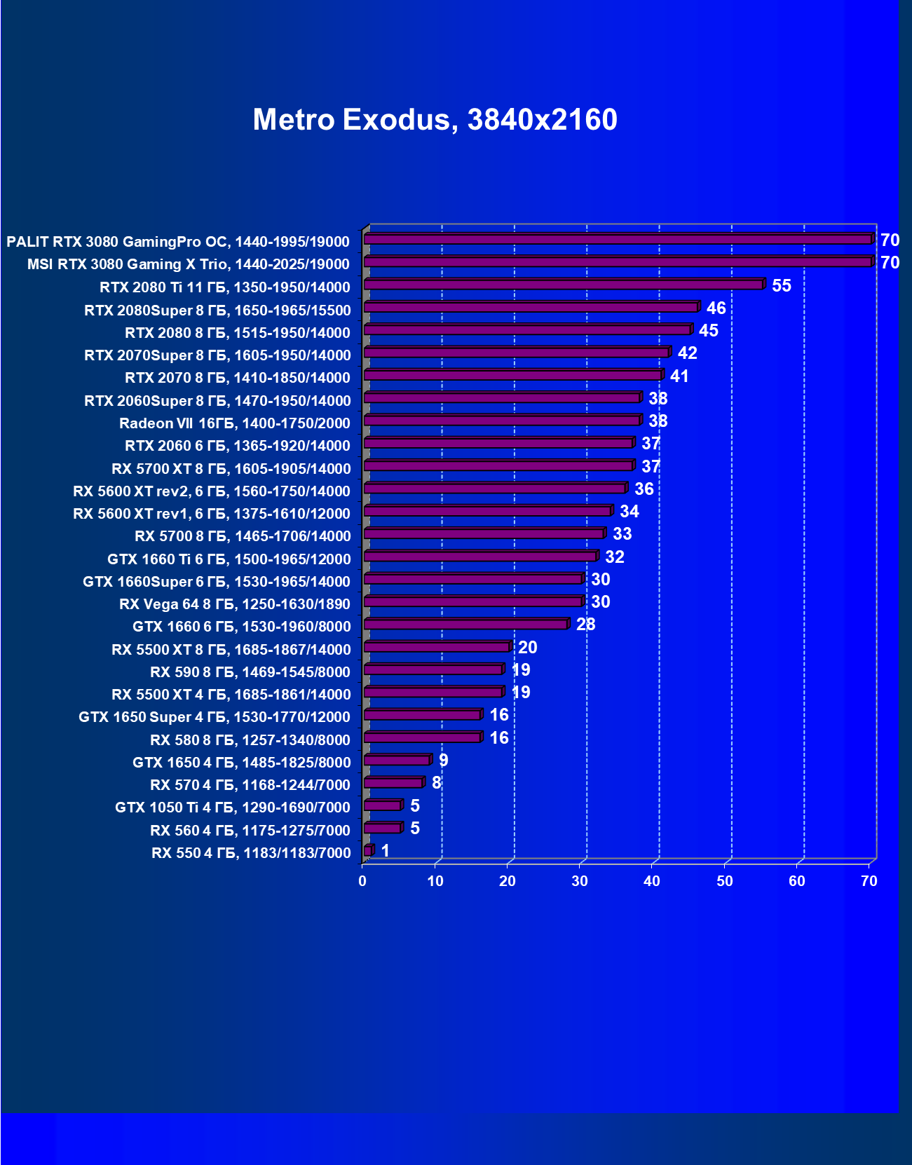 Полагаем, что комментарии излишни: лидер — он и есть лидер. Конечно, мы не сбрасываем со счетов GeForce RTX 3090, однако этот ускоритель не является чисто игровым и стоить должен, по первым прикидкам, еще вдвое дороже, поэтому напрямую их сравнивать тяжело.