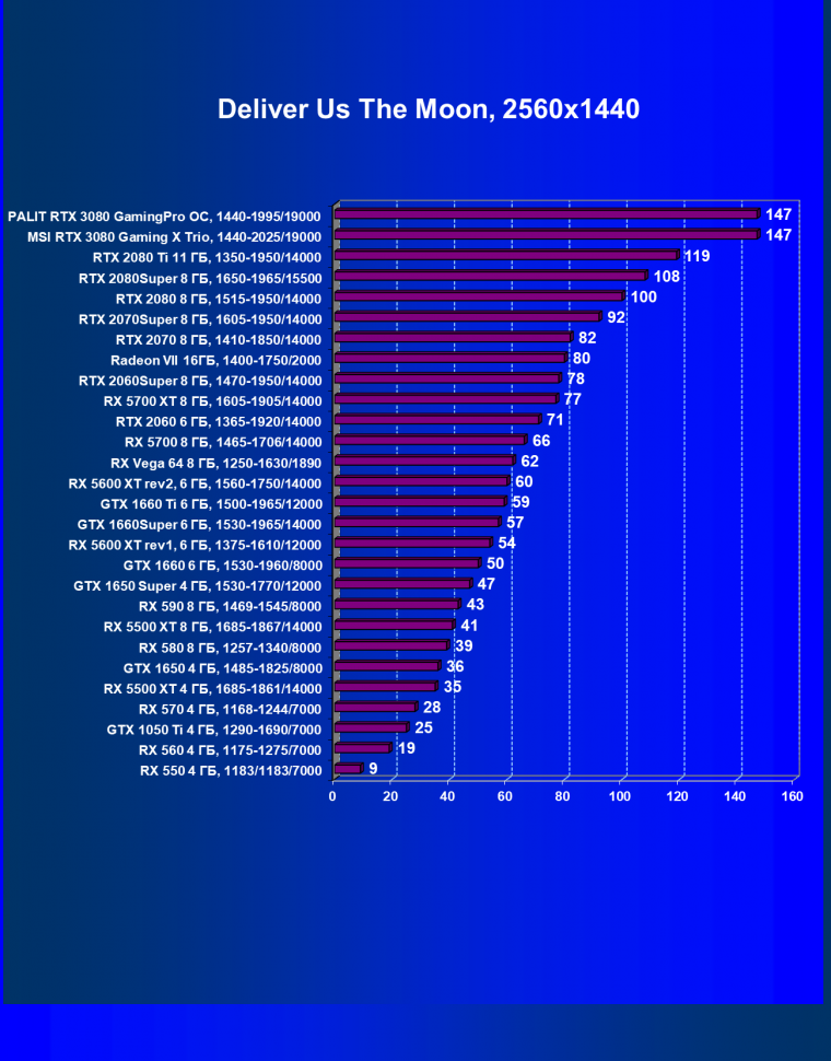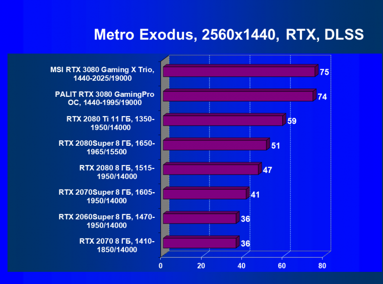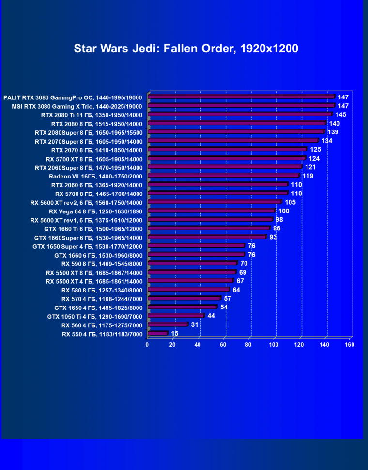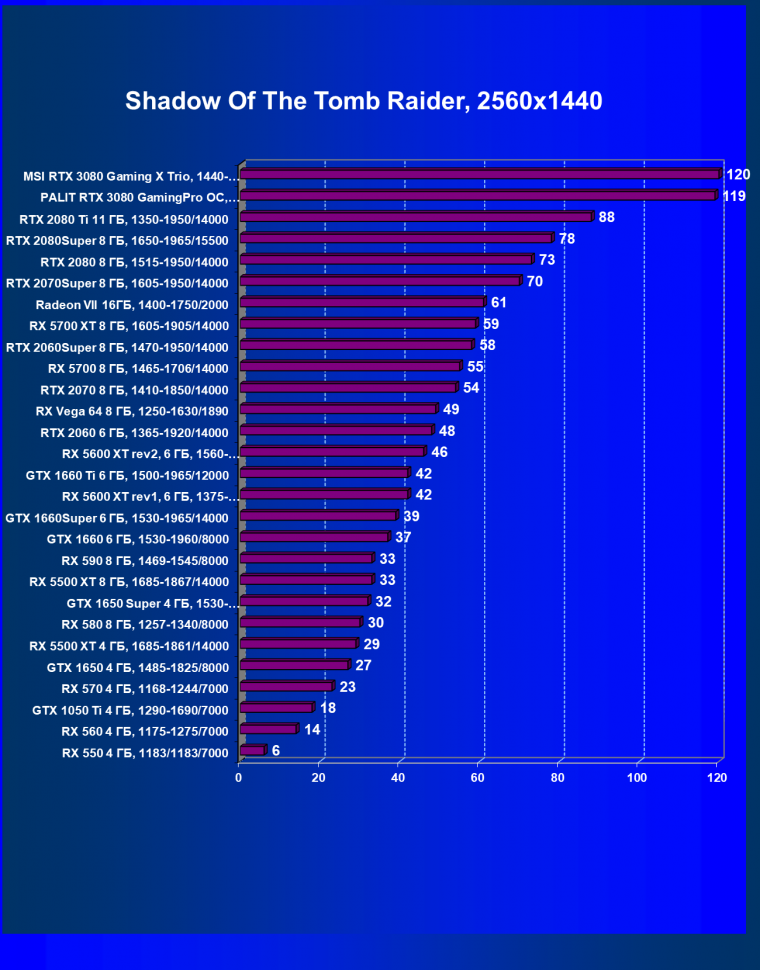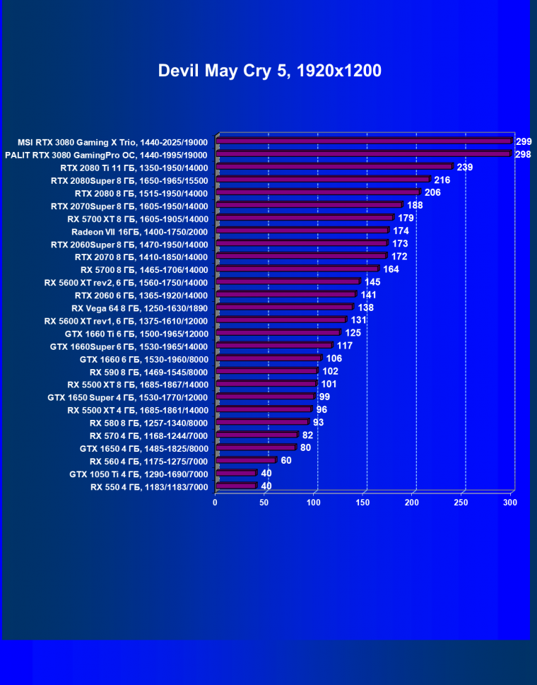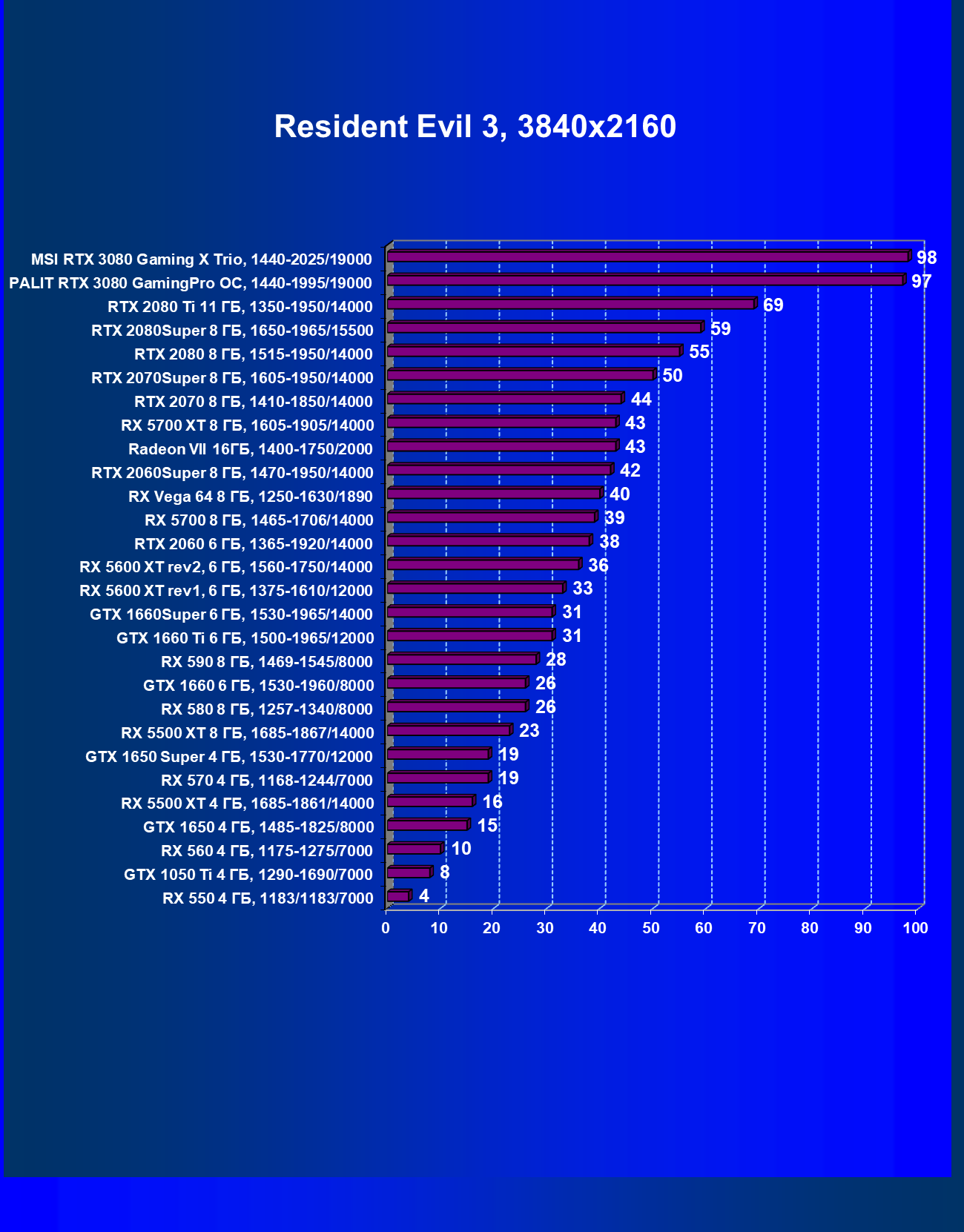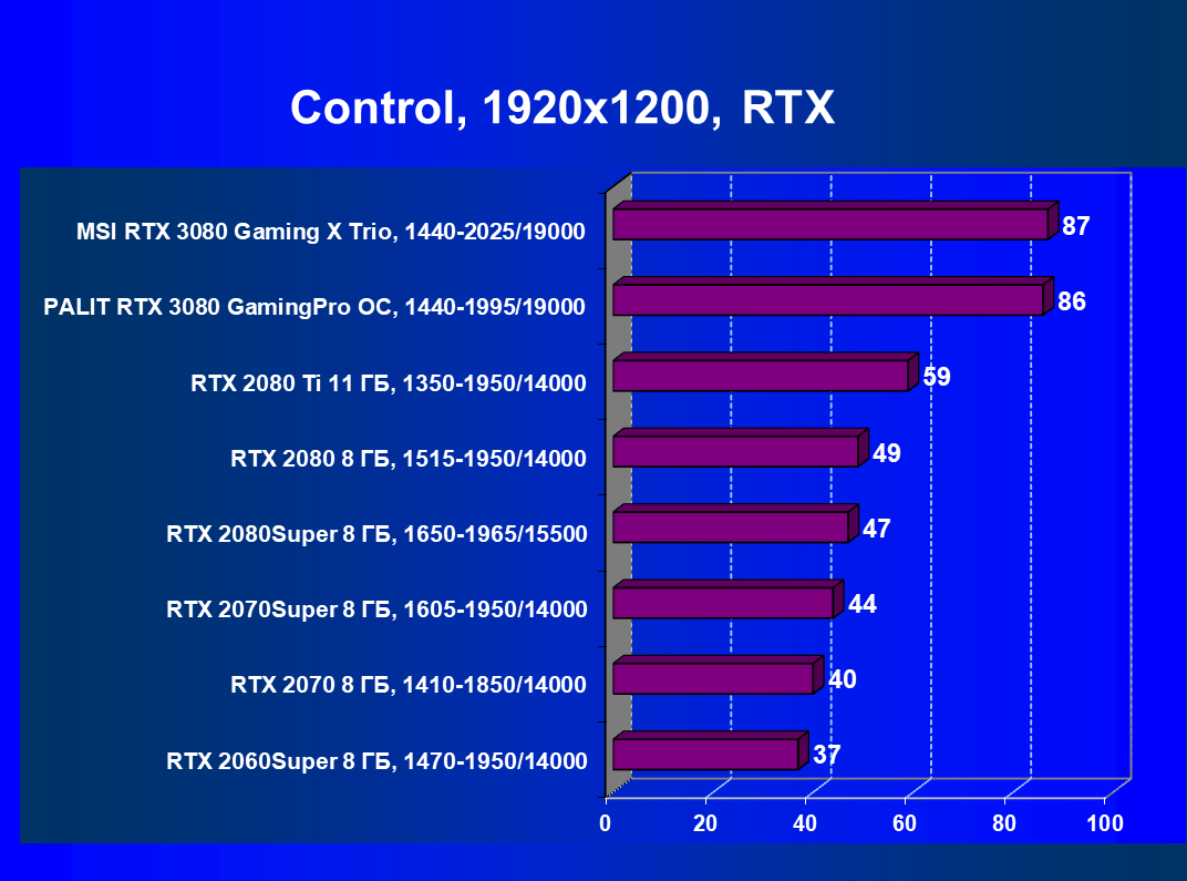 Полагаем, что комментарии излишни: лидер — он и есть лидер. Конечно, мы не сбрасываем со счетов GeForce RTX 3090, однако этот ускоритель не является чисто игровым и стоить должен, по первым прикидкам, еще вдвое дороже, поэтому напрямую их сравнивать тяжело.