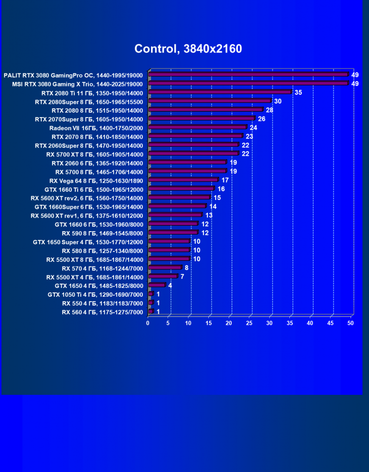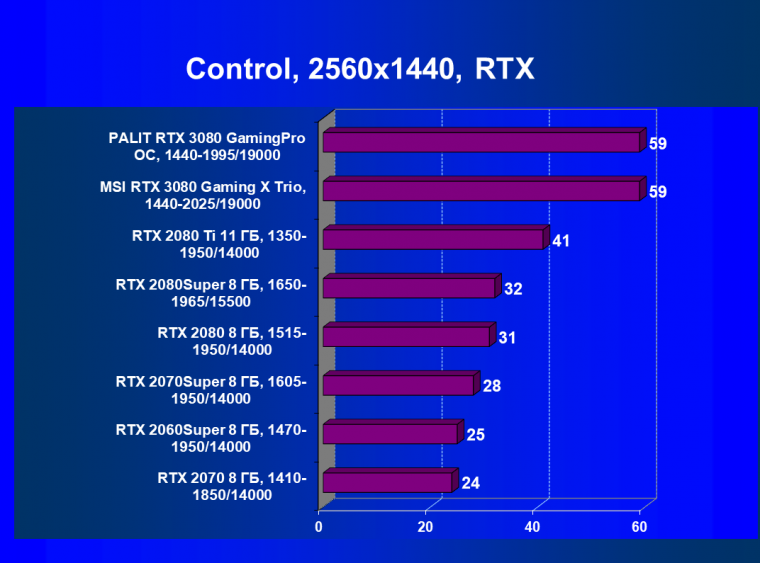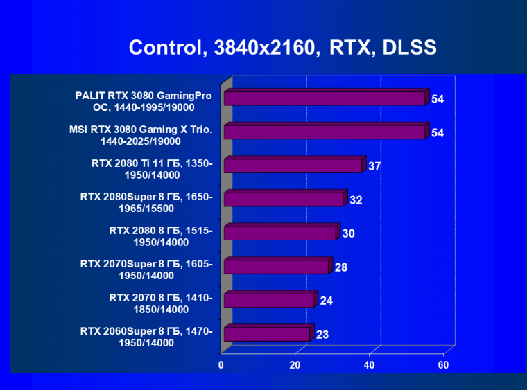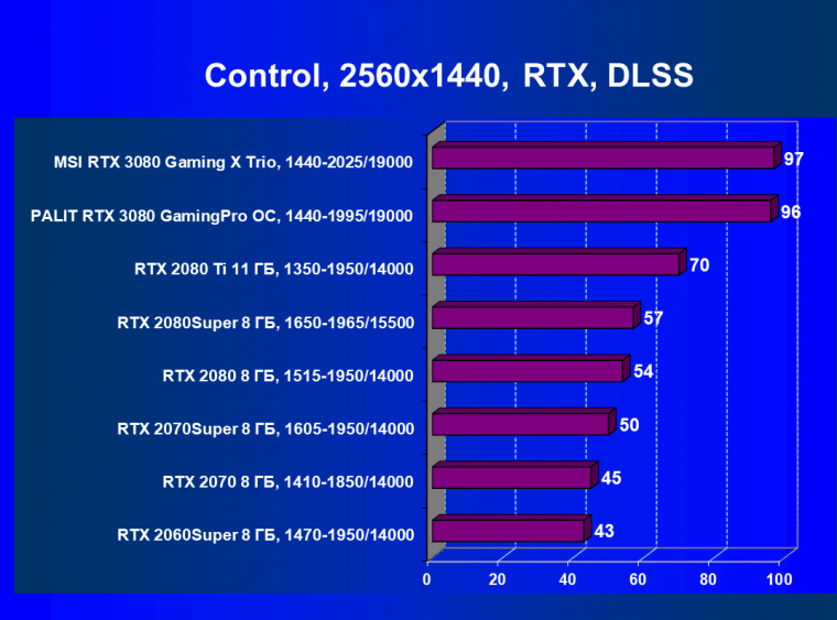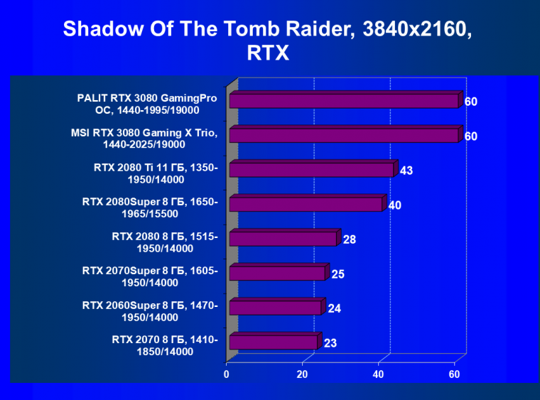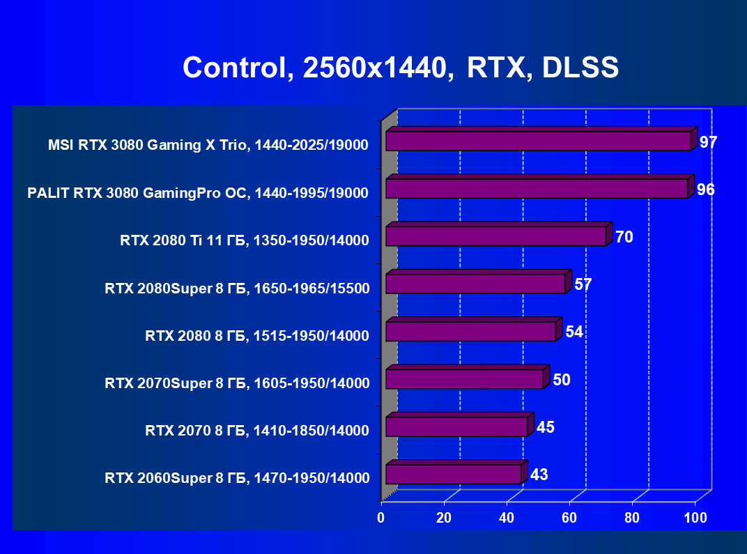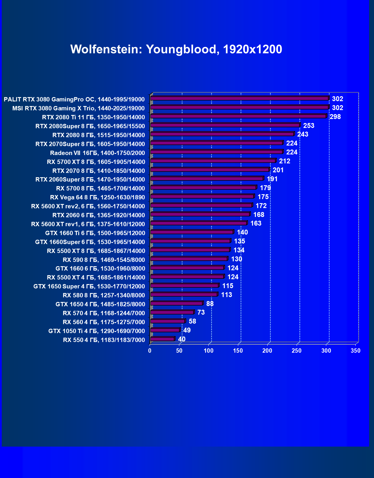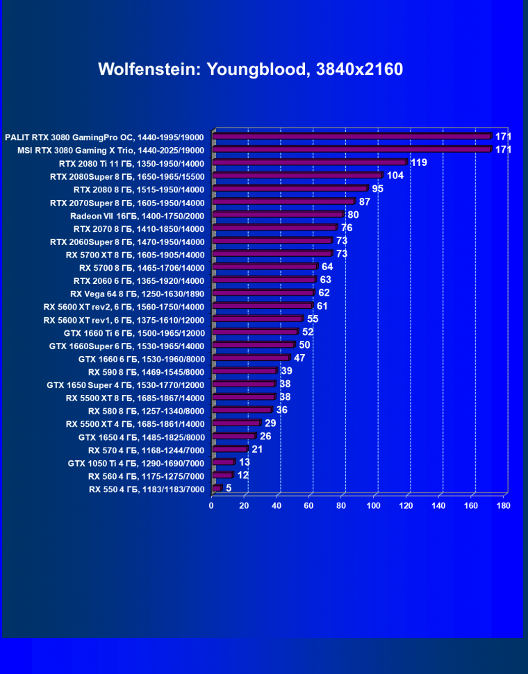 Полагаем, что комментарии излишни: лидер — он и есть лидер. Конечно, мы не сбрасываем со счетов GeForce RTX 3090, однако этот ускоритель не является чисто игровым и стоить должен, по первым прикидкам, еще вдвое дороже, поэтому напрямую их сравнивать тяжело.