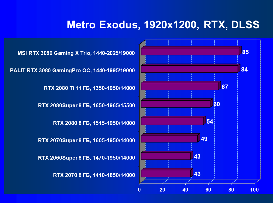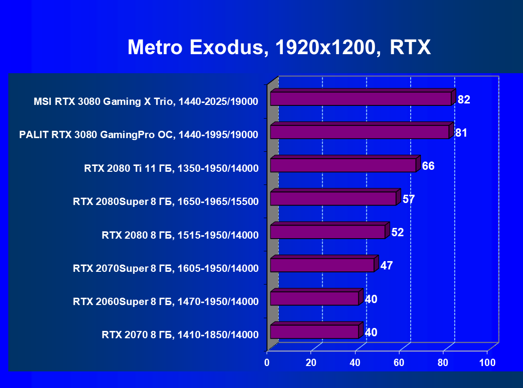 Штатные частоты памяти у карты MSI равны референсным значениям, а вот частота работы ядра немного выше. Не получив еще на тест референс-карту, мы не можем назвать точный прирост производительности относительно нее, но в сравнении с картой Palit частота ядра у MSI GeForce RTX 3080 Gaming X Trio выше на 1,5%, а производительность оказалась выше на 2% (частоты чаще поднимались выше Boost-значений).