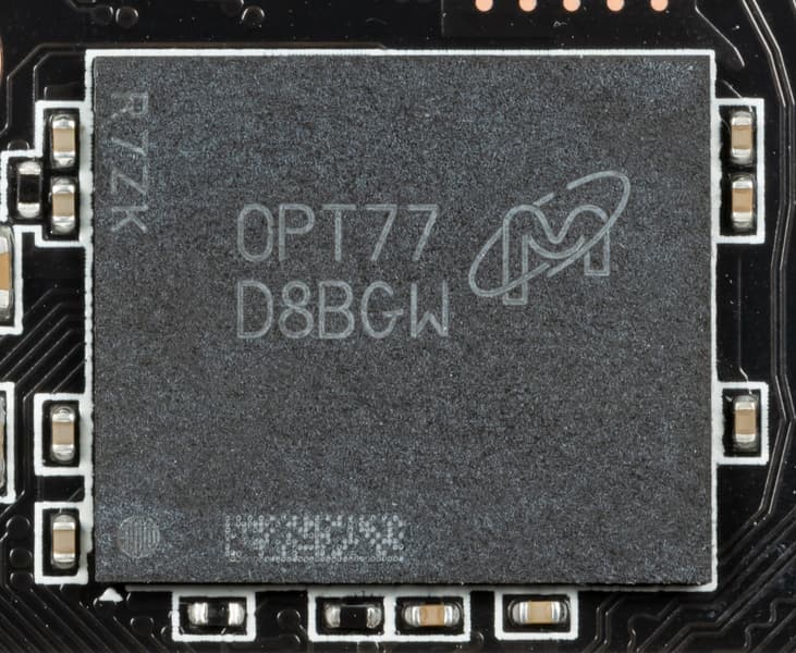 Карта имеет 10 ГБ памяти GDDR6X SDRAM, размещенной в 10 микросхемах по 8 Гбит на лицевой стороне PCB. Микросхемы памяти Micron (GDDR6X, MT61K256M32JE-19) рассчитаны на условную номинальную частоту работы в 4750 (19000) МГц. Расшифровщик кодов на упаковках FBGA находится здесь.