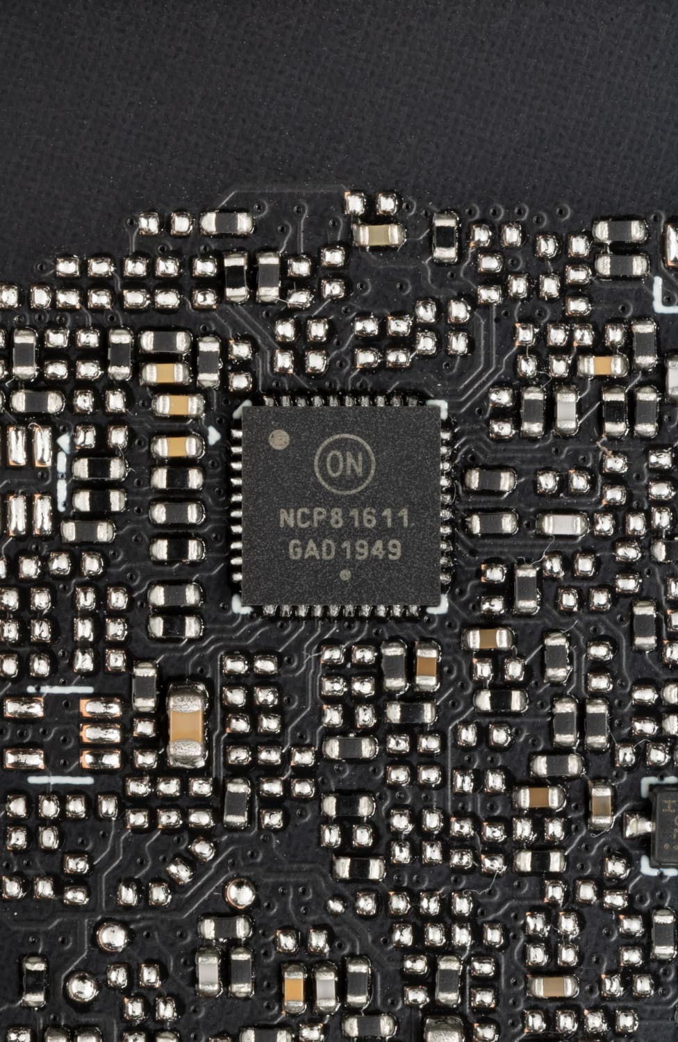 На лицевой же стороне имеется другой ШИМ-контроллер On Semiconductor NCP81611, который управляет 3-фазной схемой питания микросхем памяти.