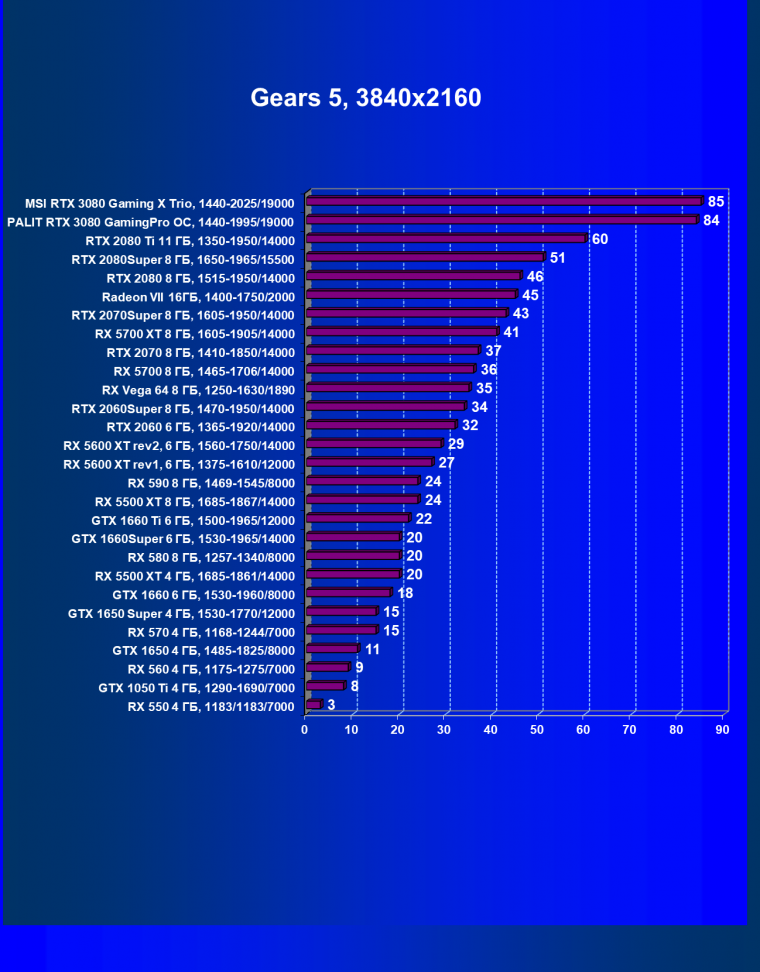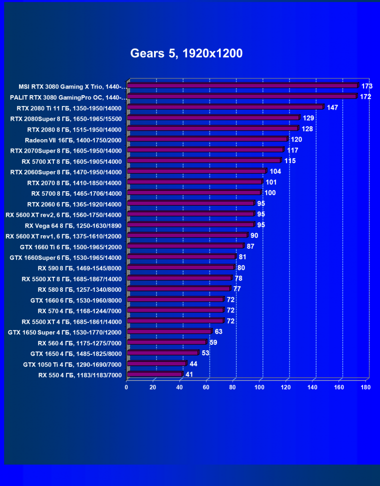 | 06 | RX 5700 XT 8 ГБ, 1605—1905/14000 | 527 | 1846 | 35 000 |