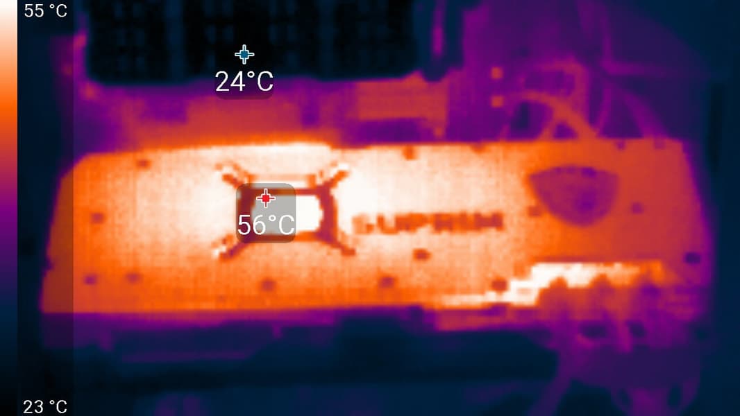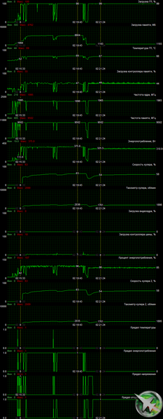 В этом случае максимальная температура ядра достигала 79 градусов, а микросхем памяти — 89 °C, что, в принципе, является приемлемым результатом для видеокарт такого уровня. Энергопотребление карты практически не изменилось (380 Вт).