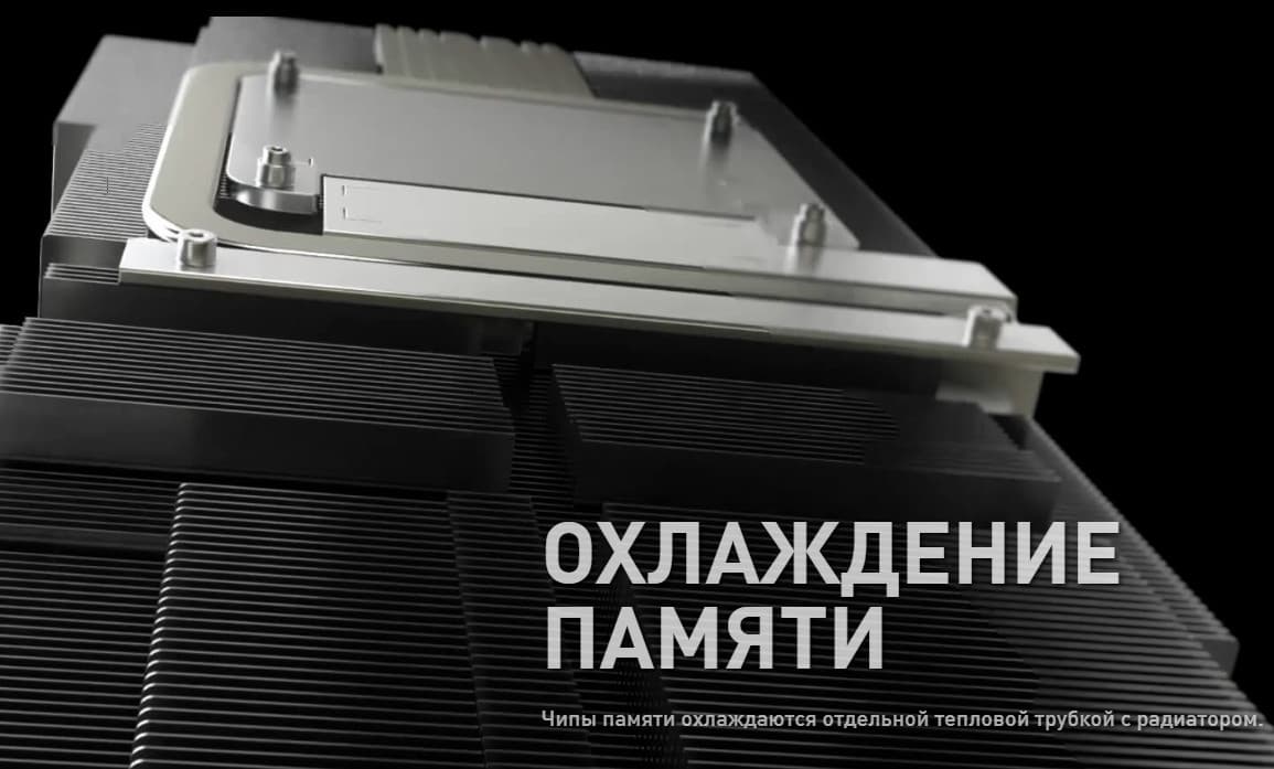 Микросхемы памяти охлаждаются пластиной, прикрученной к основанию радиатора, а преобразователи питания VRM охлаждаются с помощью отдельных подошв на том же радиаторе (одна из этих пластин служит еще и ребром жесткости).