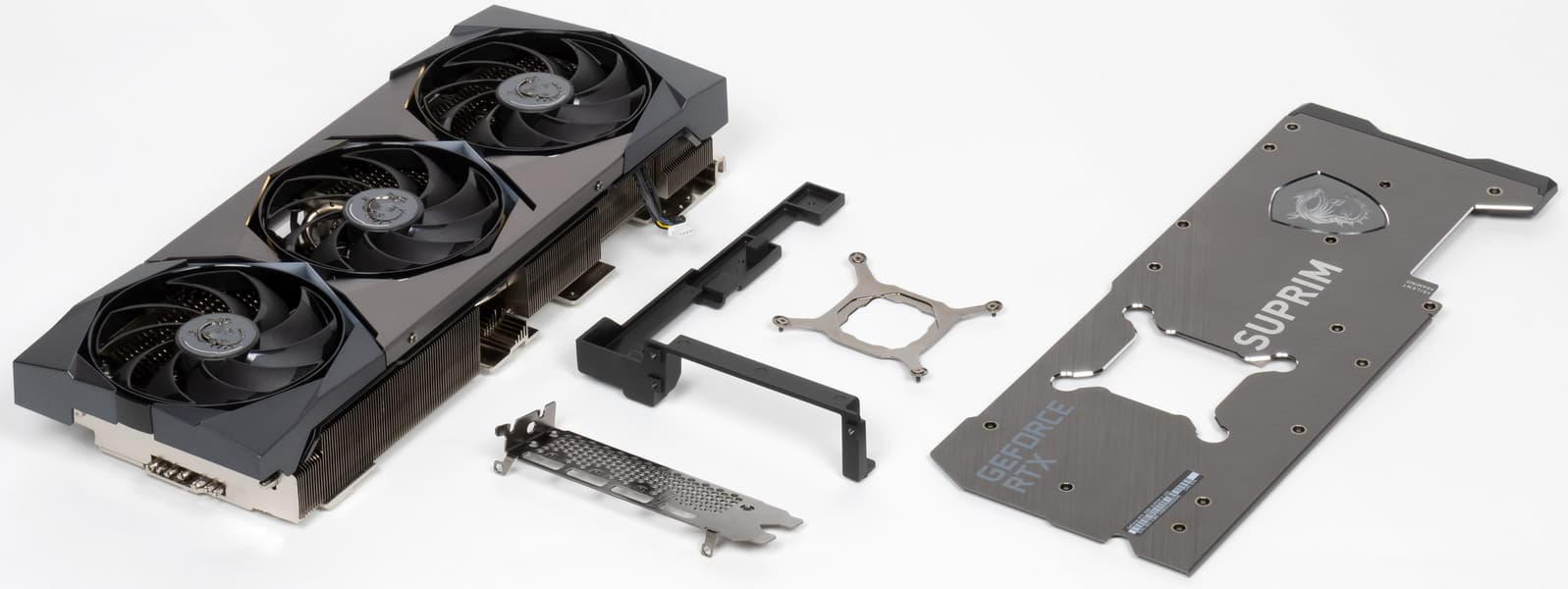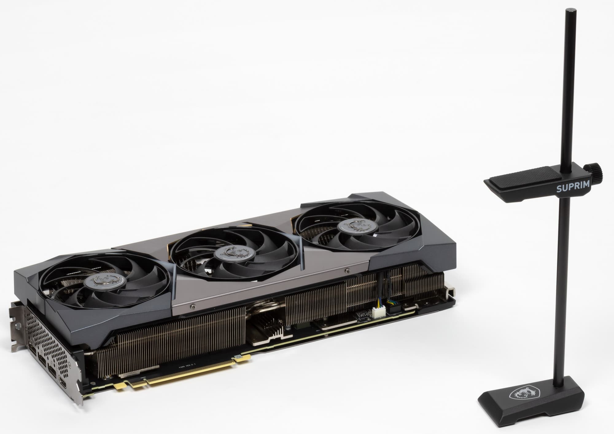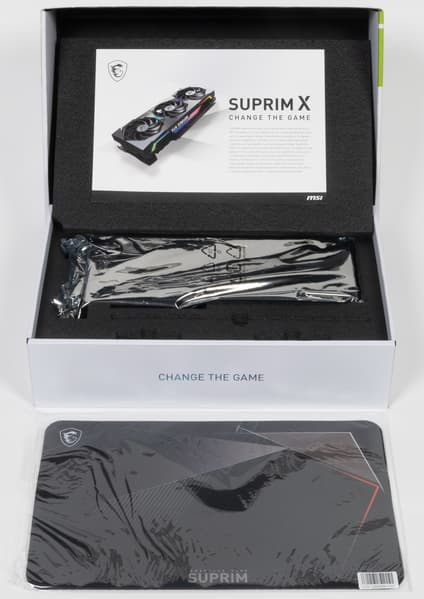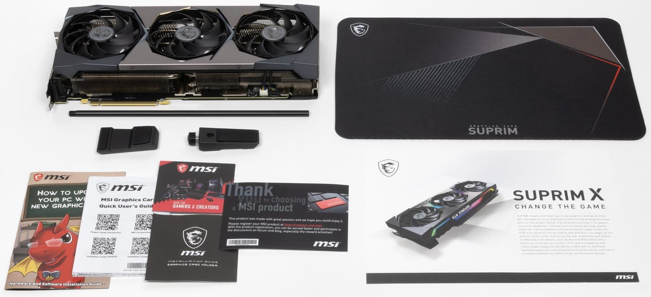MSI GeForce RTX 3080 Suprim X 10G (10 ГБ) — одна из самых длинных видеокарт, что обязательно надо учитывать при выборе карты и корпуса (в нынешних реалиях слово «выбор» в данном контексте может звучать насмешкой, однако рано или поздно ситуация с доступностью видеокарт улучшится). У нее жесткая конструкция (пластина соединяет PCB с крепежной планкой в единое целое), а еще в комплекте поставки есть подставка-штатив для установки на дно корпуса.