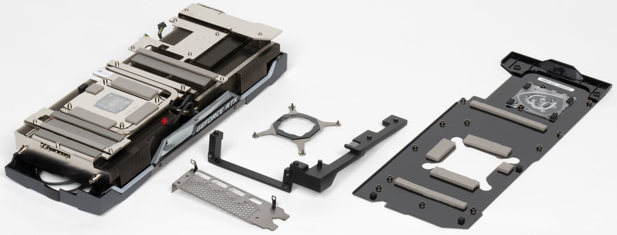 В Nvidia решили сделать у карт GeForce RTX 3080/3090 более компактную PCB и придумали новую систему охлаждения, продувающую радиатор насквозь (при этом частично оставляющую нагретый воздух в объеме корпуса). Однако в MSI предпочли пойти старым проверенным путем, сделав PCB длиннее и установив кулер привычной конструкции. Поэтому перед нами огромный двухсекционный пластинчатый никелированный радиатор с тепловыми трубками, припаянными к никелированной подошве, контактирующей с GPU. Форма ребер и концевые направляющие помогают рассеивать потоки нагретого воздуха.