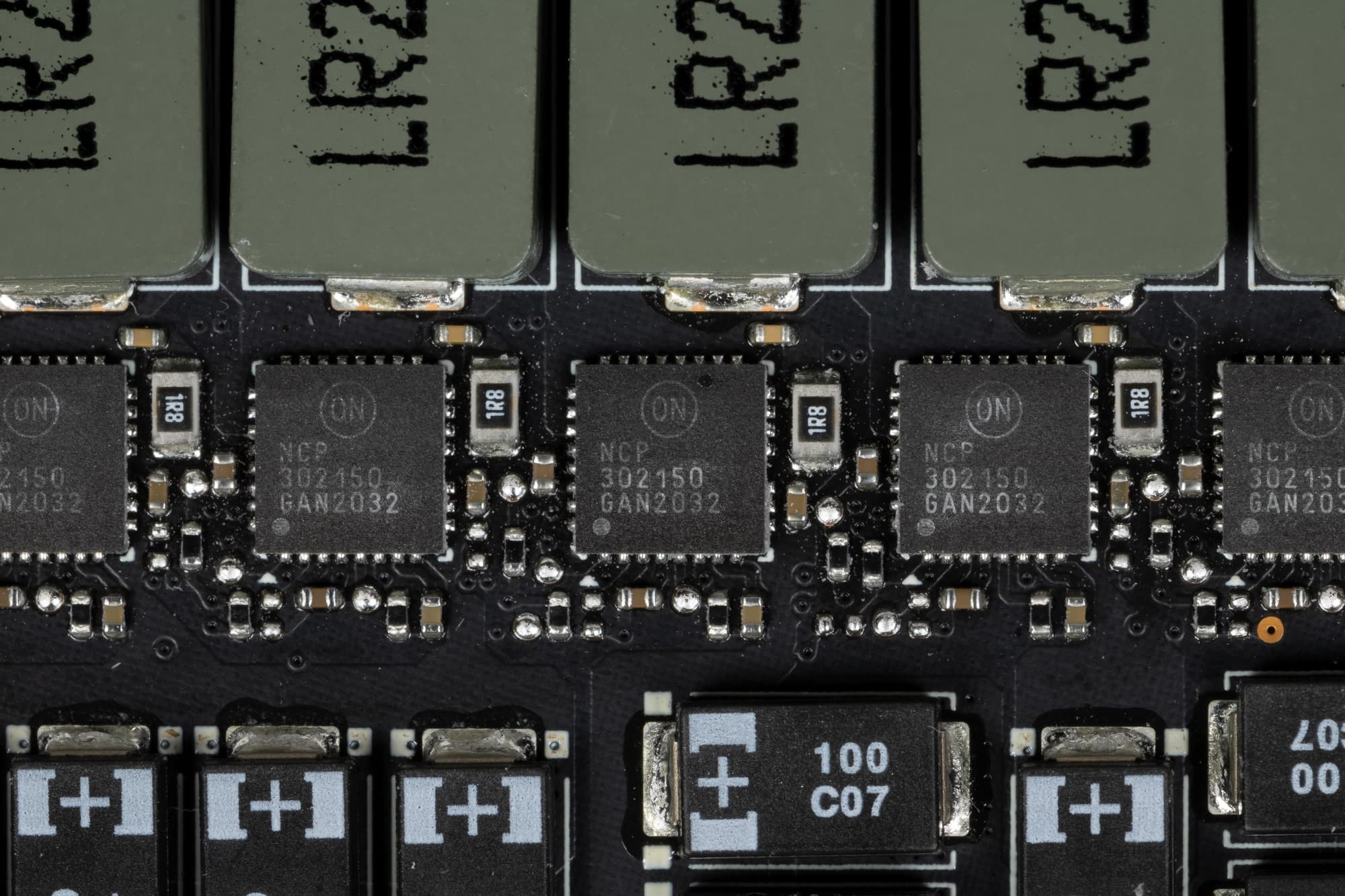 В преобразователе питания, традиционно для всех видеокарт Nvidia, используются транзисторные сборки DrMOS — в данном случае NCP302150 (On Semiconductor), каждая из которых рассчитана максимально на 50 А.