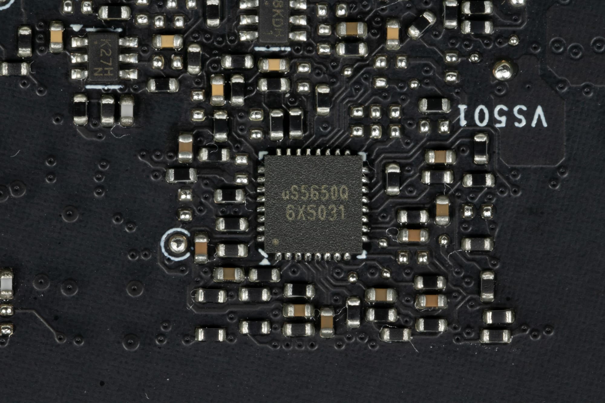 На той же лицевой стороне имеется ШИМ-контроллер uS5650Q (uPI Semiconductor), который управляет 4-фазной схемой питания микросхем памяти.