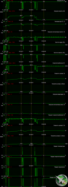 - по умолчанию (лимит потребления снижен до 70%, частота GPU снижена на 200 МГц, частота памяти по умолчанию, вентиляторы выставлены в ручном режиме на 70%)
