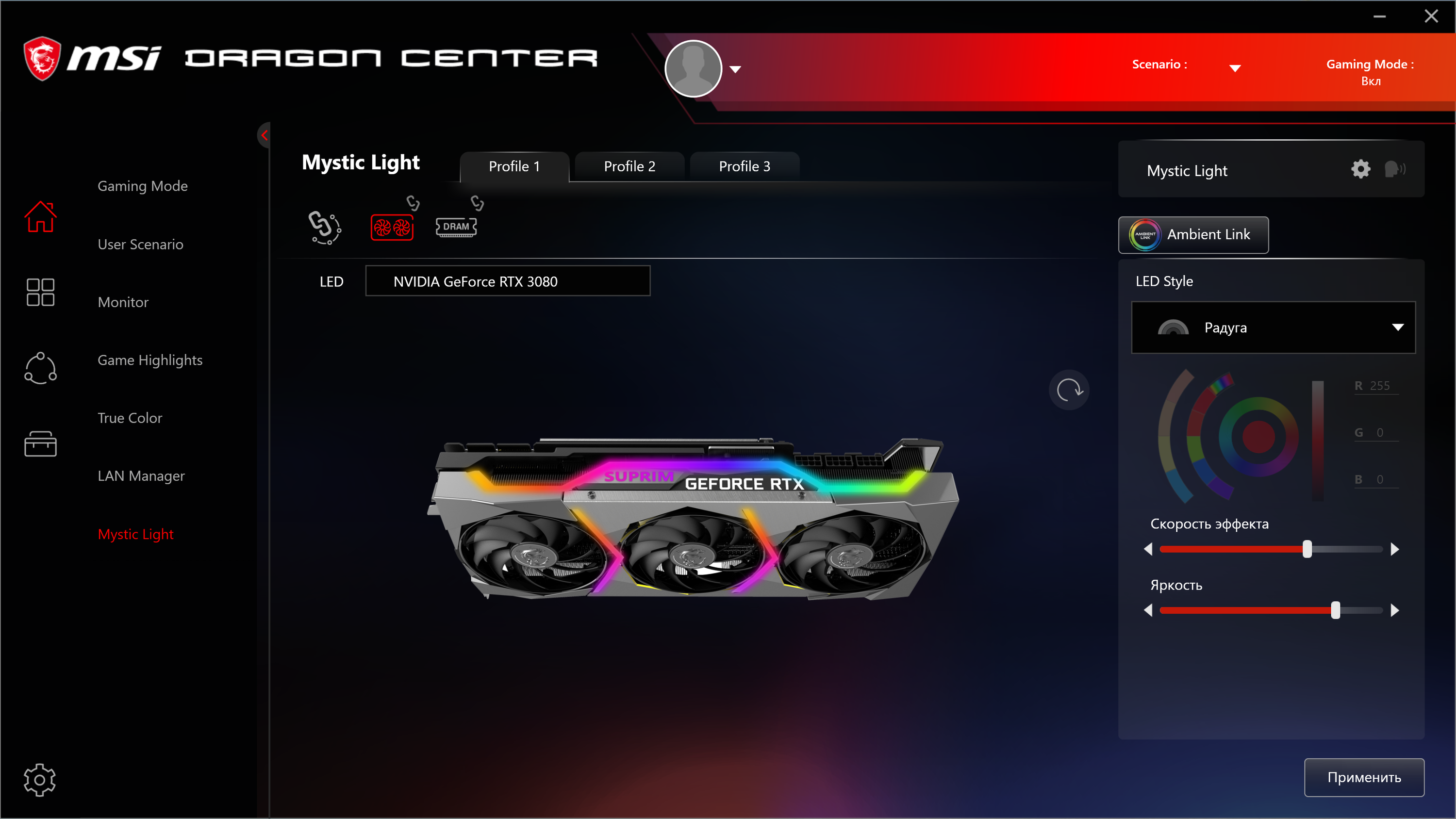 Штатные частоты памяти у карты MSI равны референсным значениям, а вот с частотой работы ядра сложнее. В режиме по умолчанию (Gaming или Silent) Boost-значение частоты GPU увеличено почти на 12% относительно карты Nvidia GeForce RTX 3080 Founders Edition, однако максимальные частоты у них довольно близки (1995 против 1965 МГц), а энергопотребление карты MSI доходило до 380 Вт. Исследования показали, что в среднем мы получили в играх прирост производительности в 7,5% относительно референс-карты. При этом есть еще дополнительный режим Extreme, активируемый через программу Dragon Center (о ней ниже), в нем Boost-частота ядра поднимается на 12,7% относительно референсной, а максимум остается примерно таким же (превышает референсный максимум всего на 2%). В итоге этот режим обеспечивает в играх прирост производительности около 7,8% (речь идет, разумеется, о разрешении 4К) относительно GeForce RTX 3080 FE.