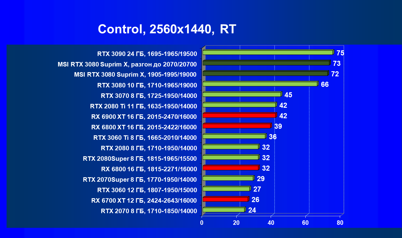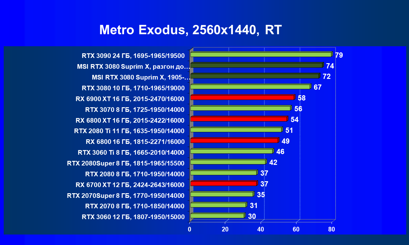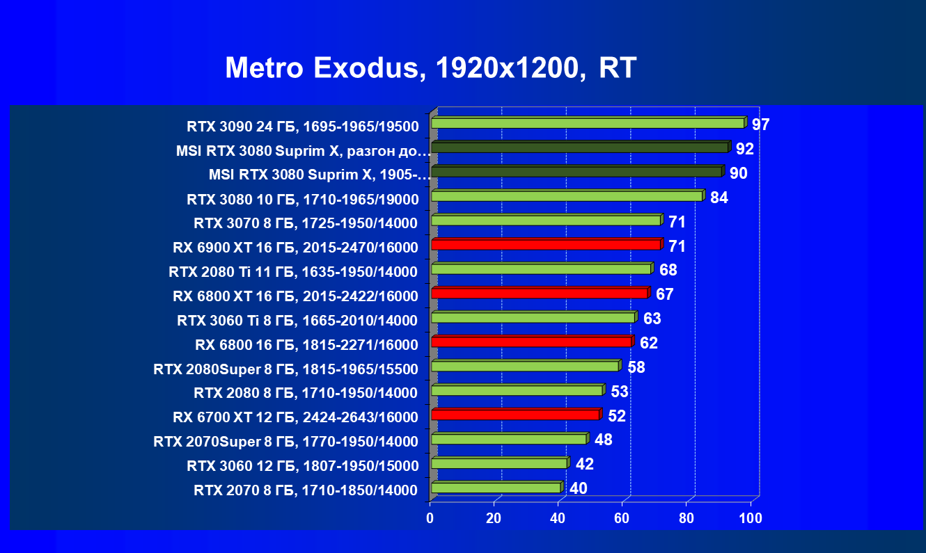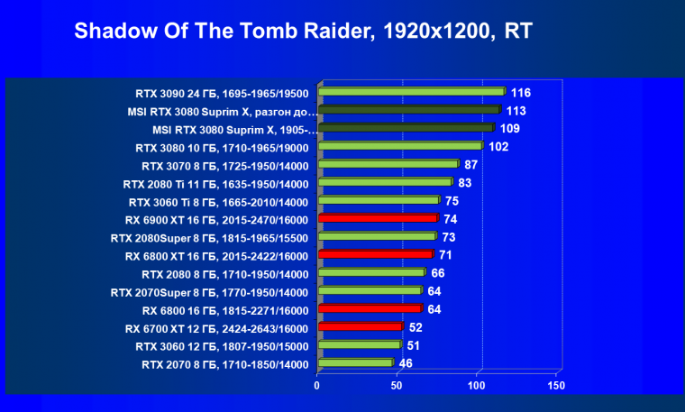 Несмотря на то, что формально конкурентом для RTX 3080 является Radeon RX 6800 XT, в данный момент все цены так поменялись, что теперь даже Radeon RX 6900 XT оказался дешевле. И если говорить о производительности в играх с традиционной растеризацией, то карта MSI за счет повышенных частот смогла обойти Radeon RX 6800 XT, а ручной разгон позволил ей догнать и Radeon RX 6900 XT. Для «классических» игр решения AMD сейчас смотрятся намного симпатичнее.