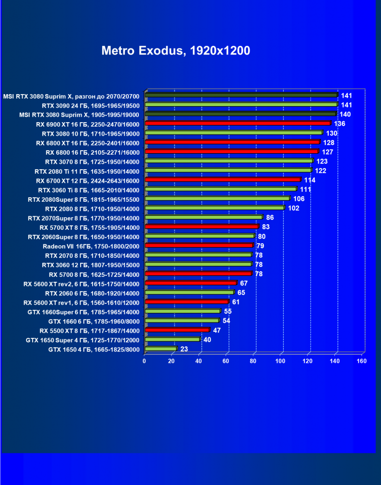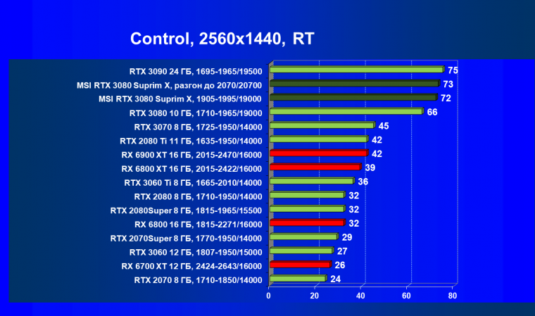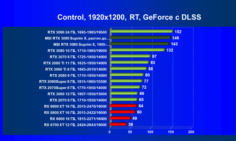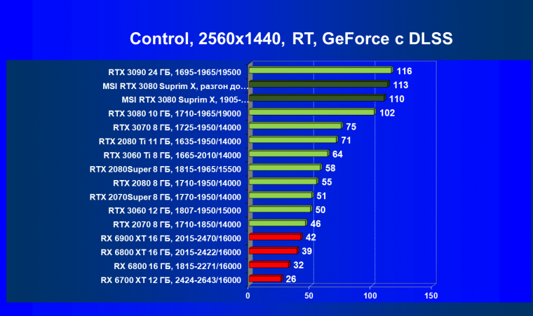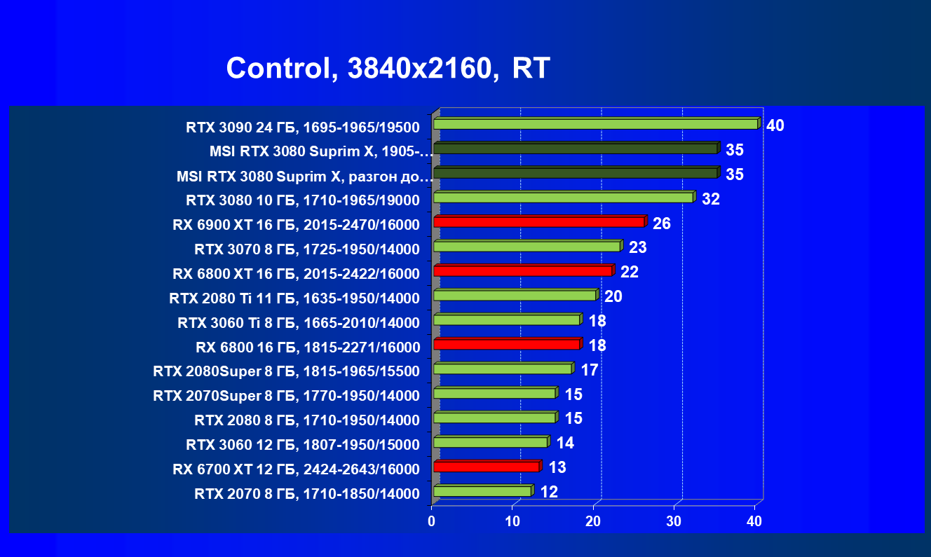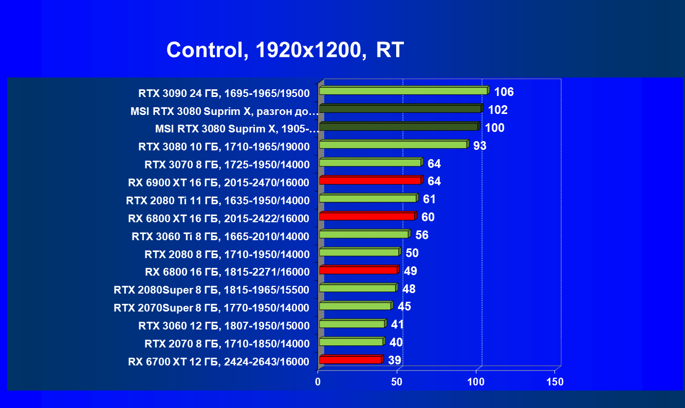Несмотря на то, что формально конкурентом для RTX 3080 является Radeon RX 6800 XT, в данный момент все цены так поменялись, что теперь даже Radeon RX 6900 XT оказался дешевле. И если говорить о производительности в играх с традиционной растеризацией, то карта MSI за счет повышенных частот смогла обойти Radeon RX 6800 XT, а ручной разгон позволил ей догнать и Radeon RX 6900 XT. Для «классических» игр решения AMD сейчас смотрятся намного симпатичнее.