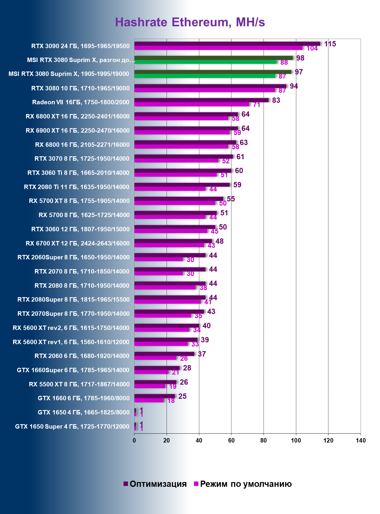 | 03 | MSI RTX 3080 Suprim X, 1905—1995/19000 | 240 | 11 | 210 000 |