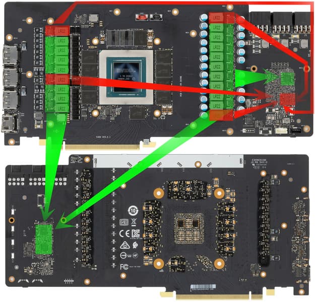 Зеленым цветом отмечена схема питания ядра, красным — памяти. При этом удвоителей (даблеров) фаз нет, для управления схемой питания GPU используются аж три ШИМ-контроллера: два uP9512R (uPI Semiconductor), расположенные на оборотной стороне платы…