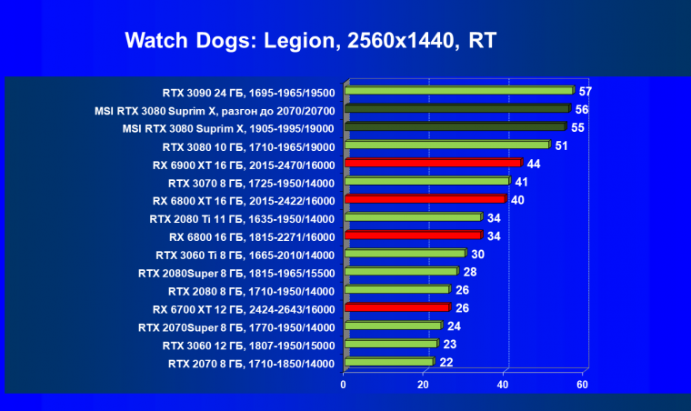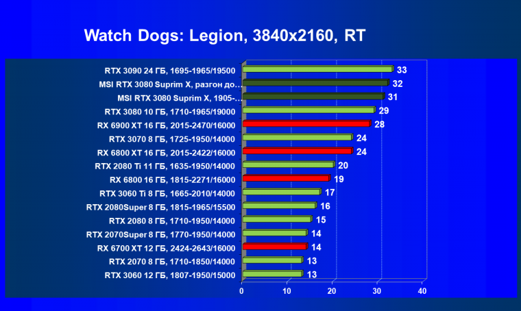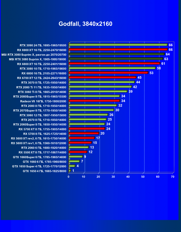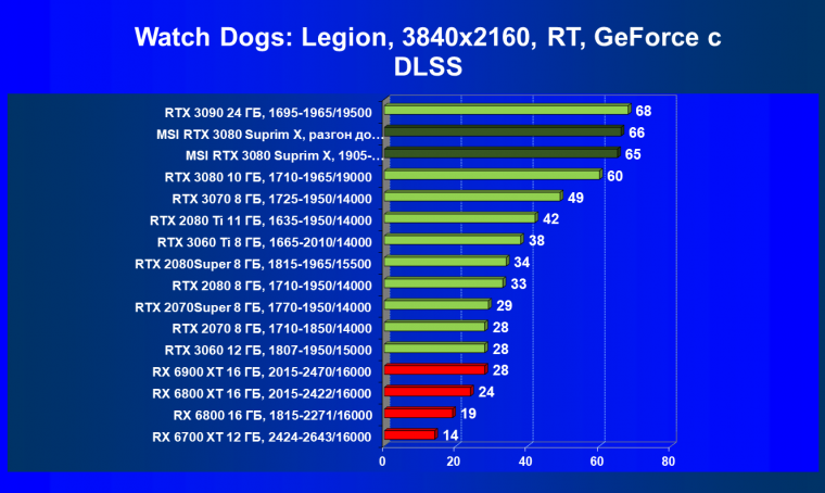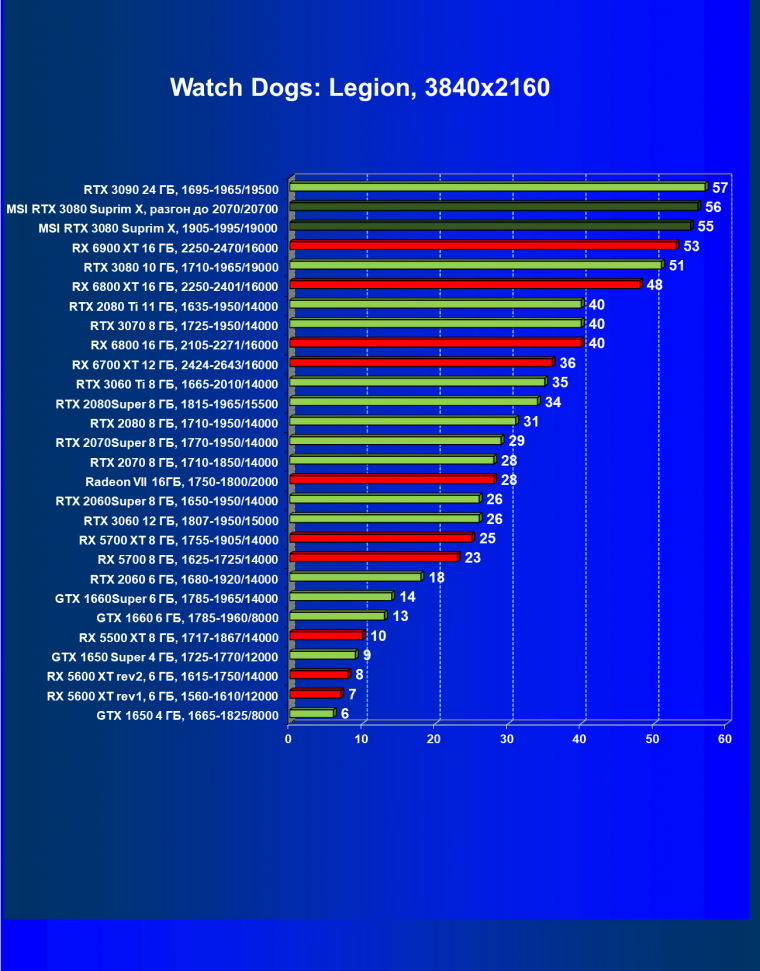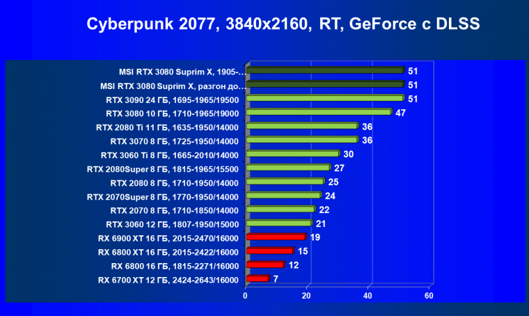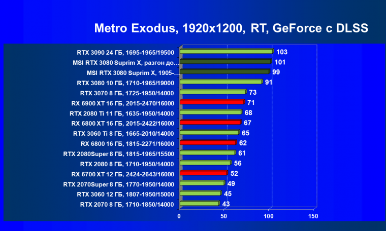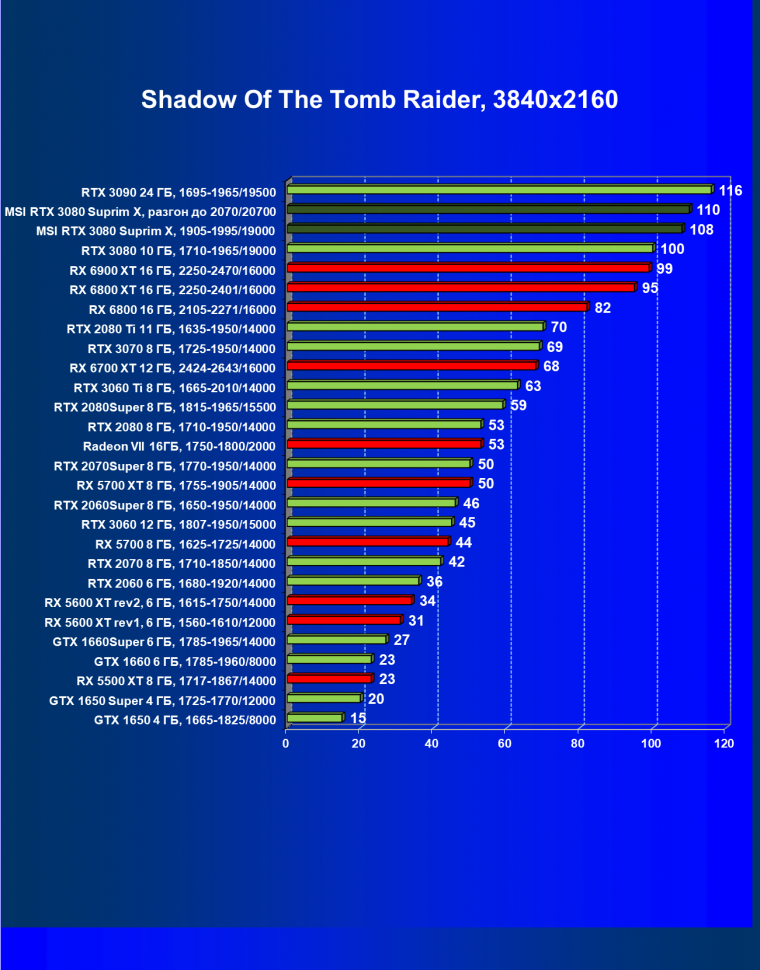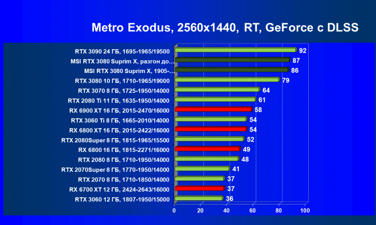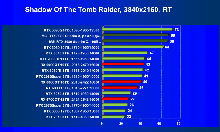 При включении RT производительность Radeon RX 6800 XT и Radeon RX 6900 XT падает намного сильнее, нежели у GeForce RTX 3080, поэтому обе видеокарты AMD оказались ниже в рейтинге. Тем не менее, все они «потянут» 4К с максимальным качеством графики. Карта MSI снова в лидерах за счет повышенных фабрично частот, а также ручного разгона (если не считать GeForce RTX 3090 — но его стоимость просто улетела в космос).