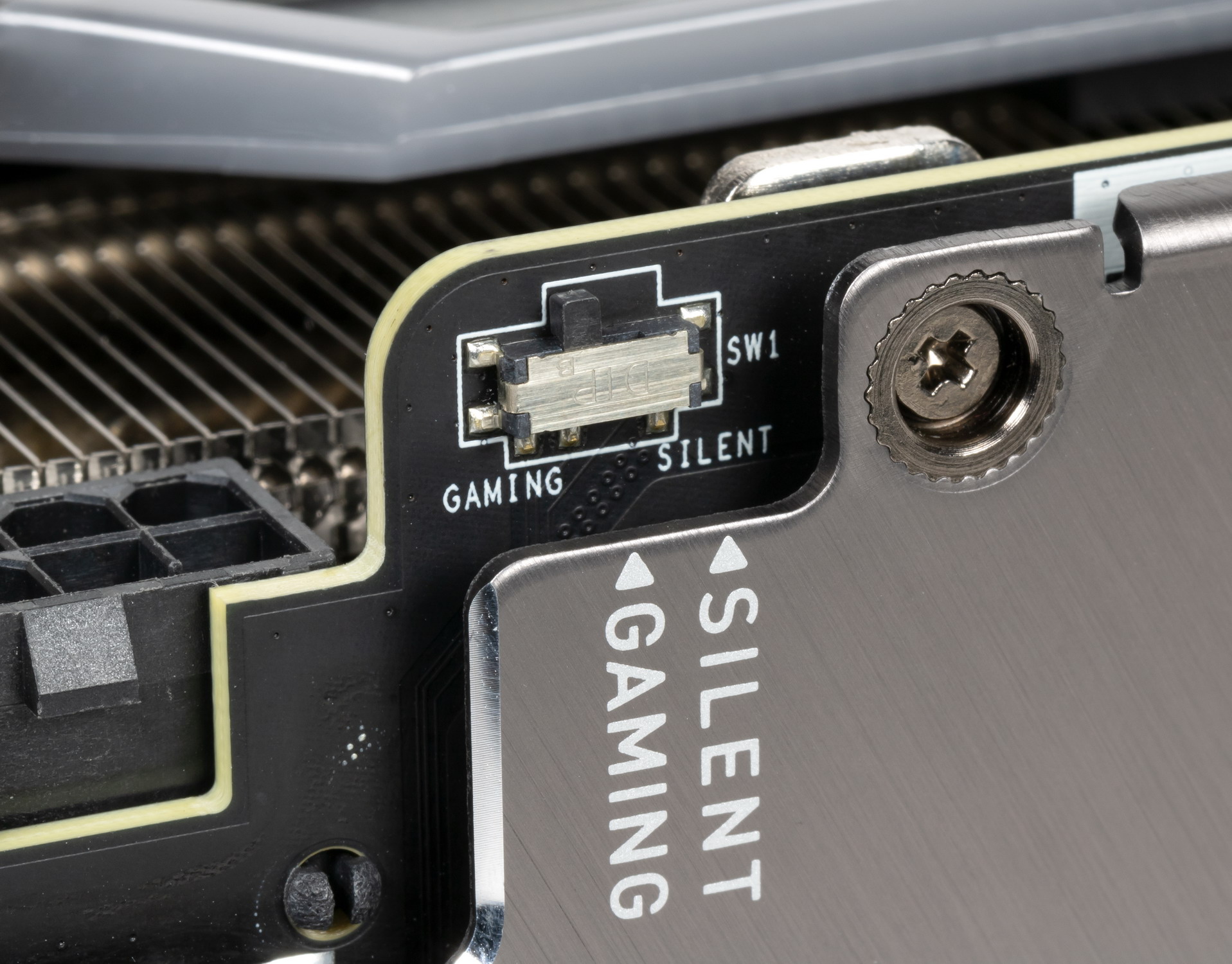 Карта имеет два режима работы, они заложены в двух вариантах BIOS, которые переключаются на верхнем торце карты: Gaming и Silent. Разница между режимами заключается лишь в оборотах вентиляторов, частоты GPU/памяти одинаковые.